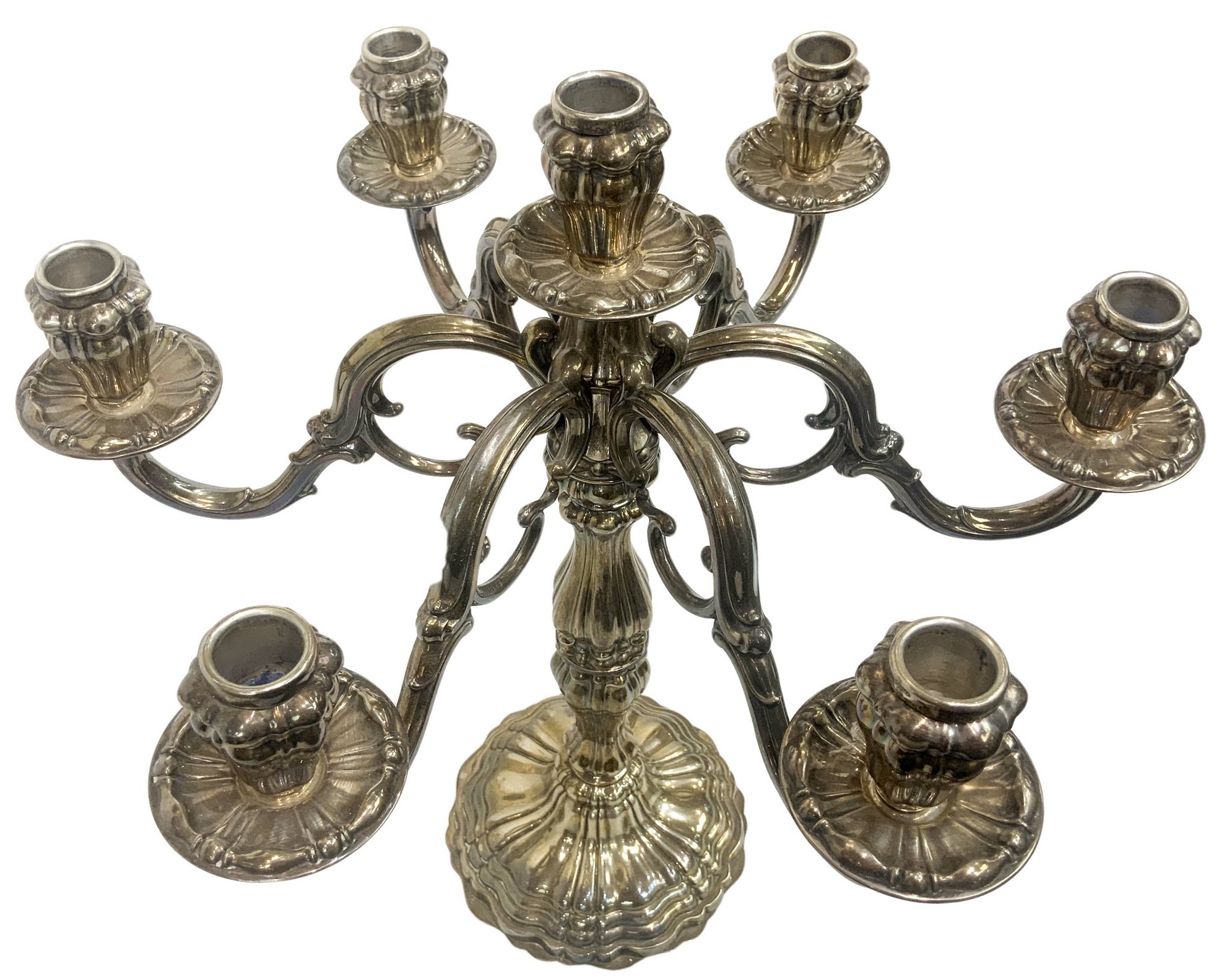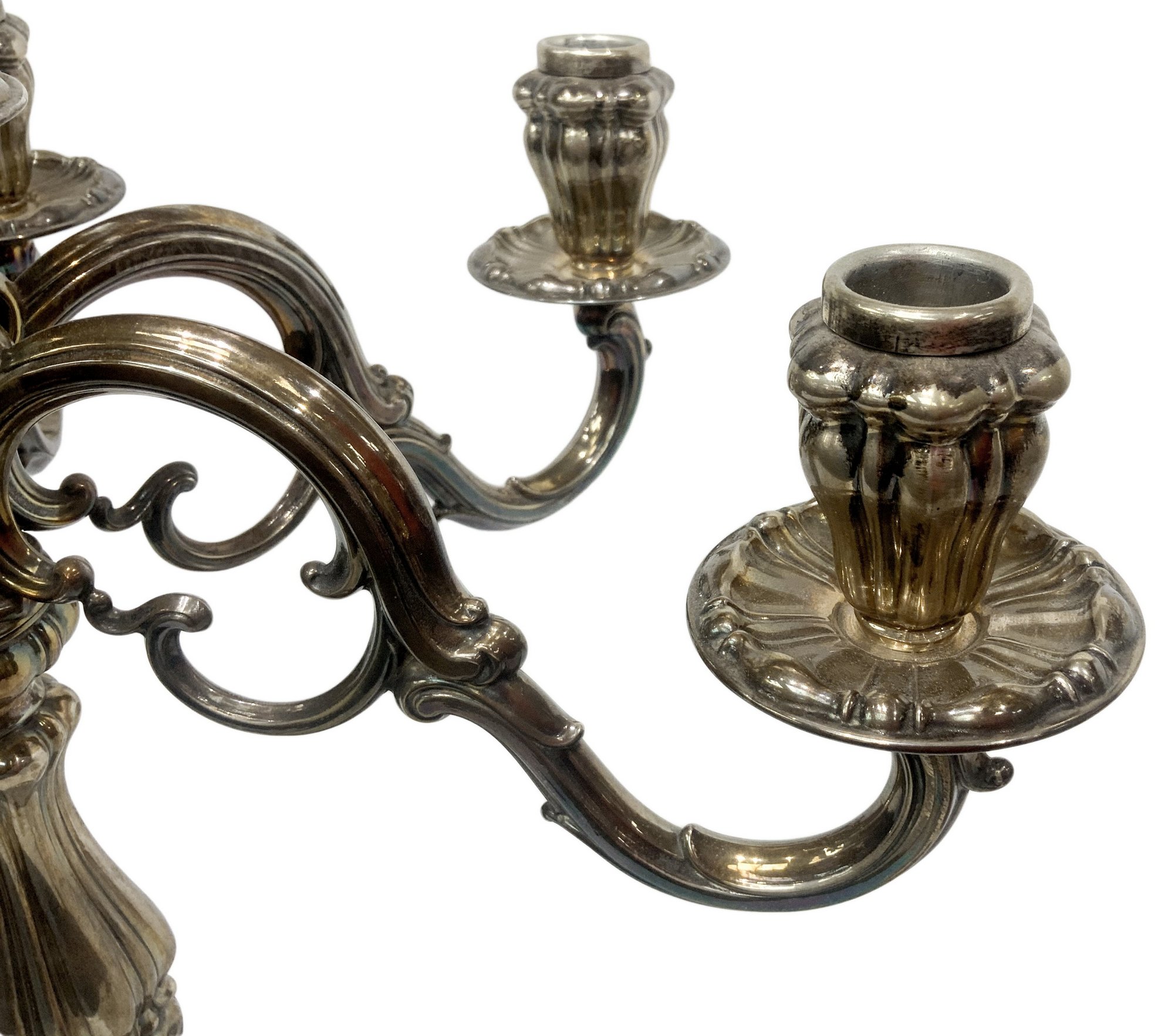 Candelabro in argento a sette luci, XX secolo, punzone argentieri Ricci & Co, Alessandria (1935). Peso Kg 2,175. H cm 47, diametro max cm 47.