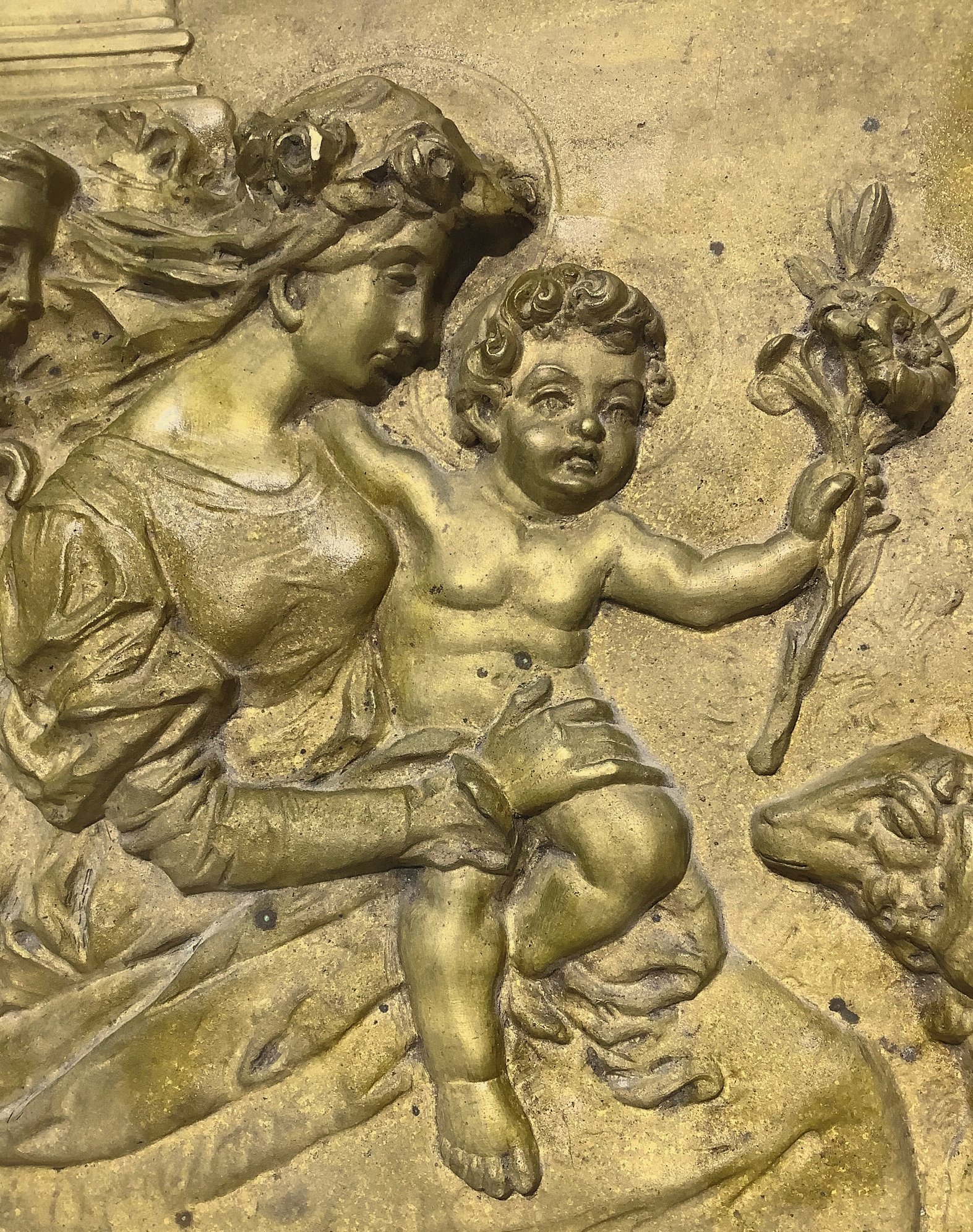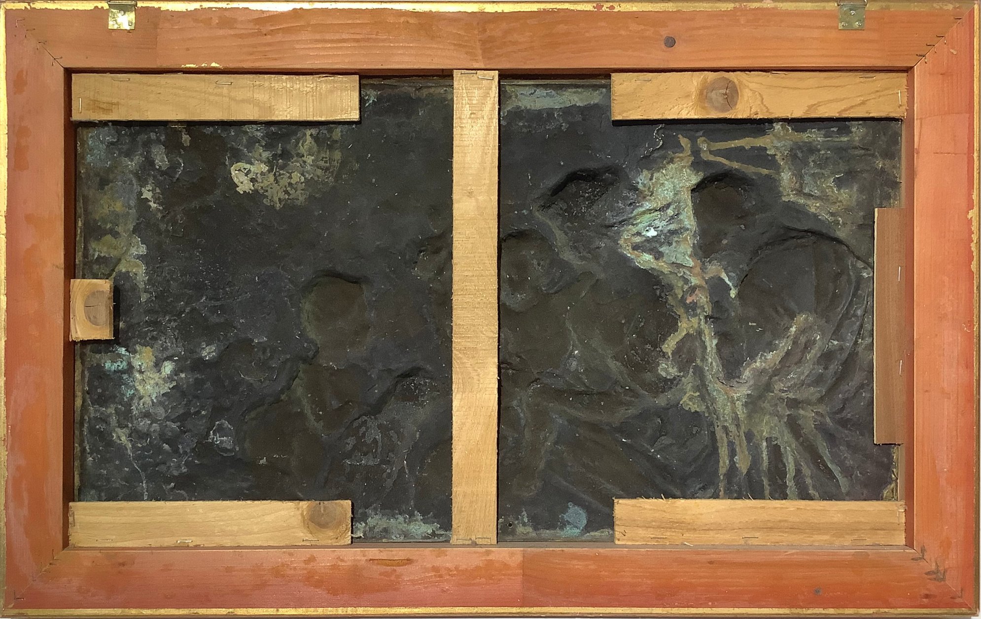 Sacra Famiglia con S. Giovannino, fine XIX secolo. Lastra di ghisa dorata a rilievo, in cornice dorata. Cm 37x67