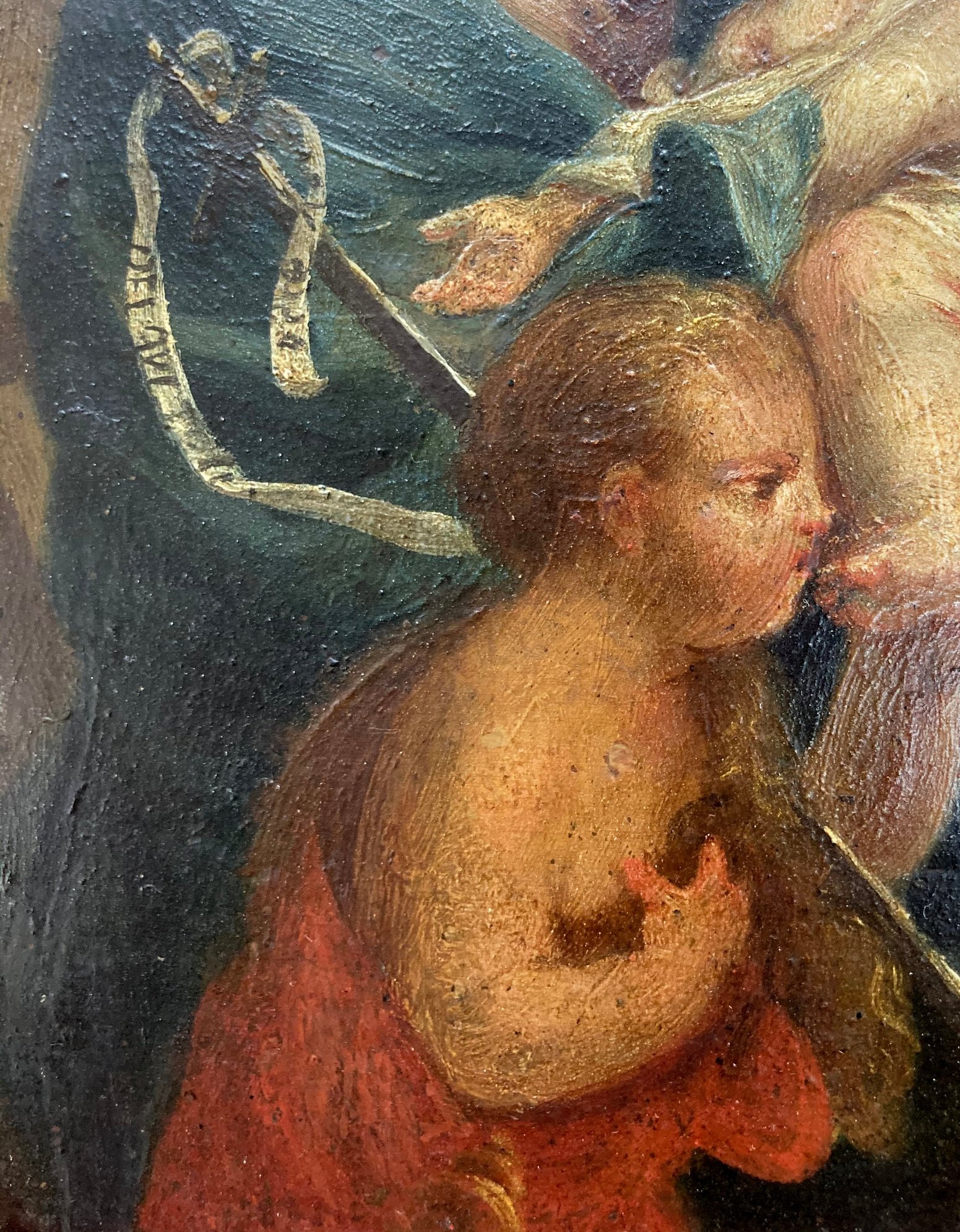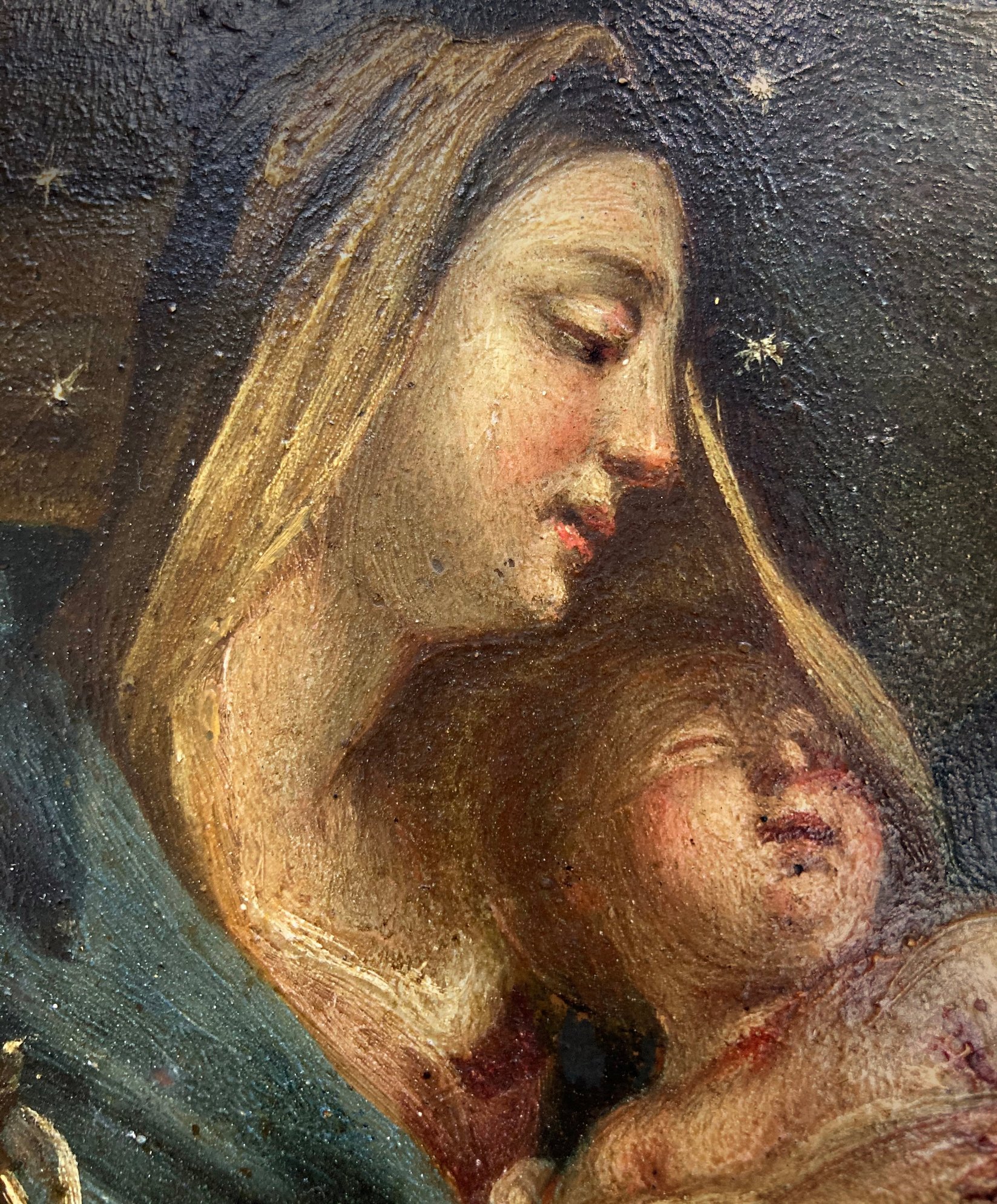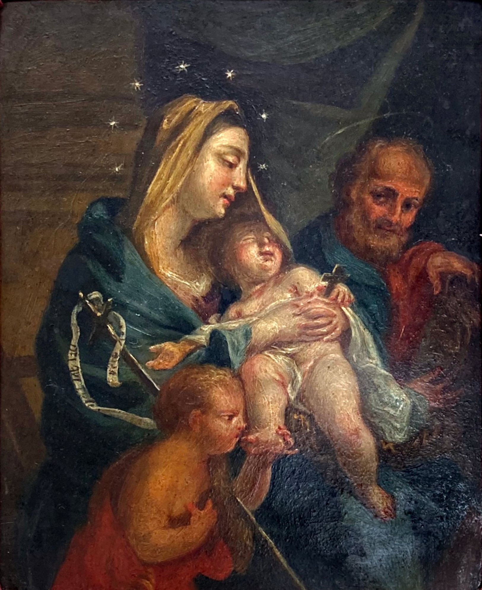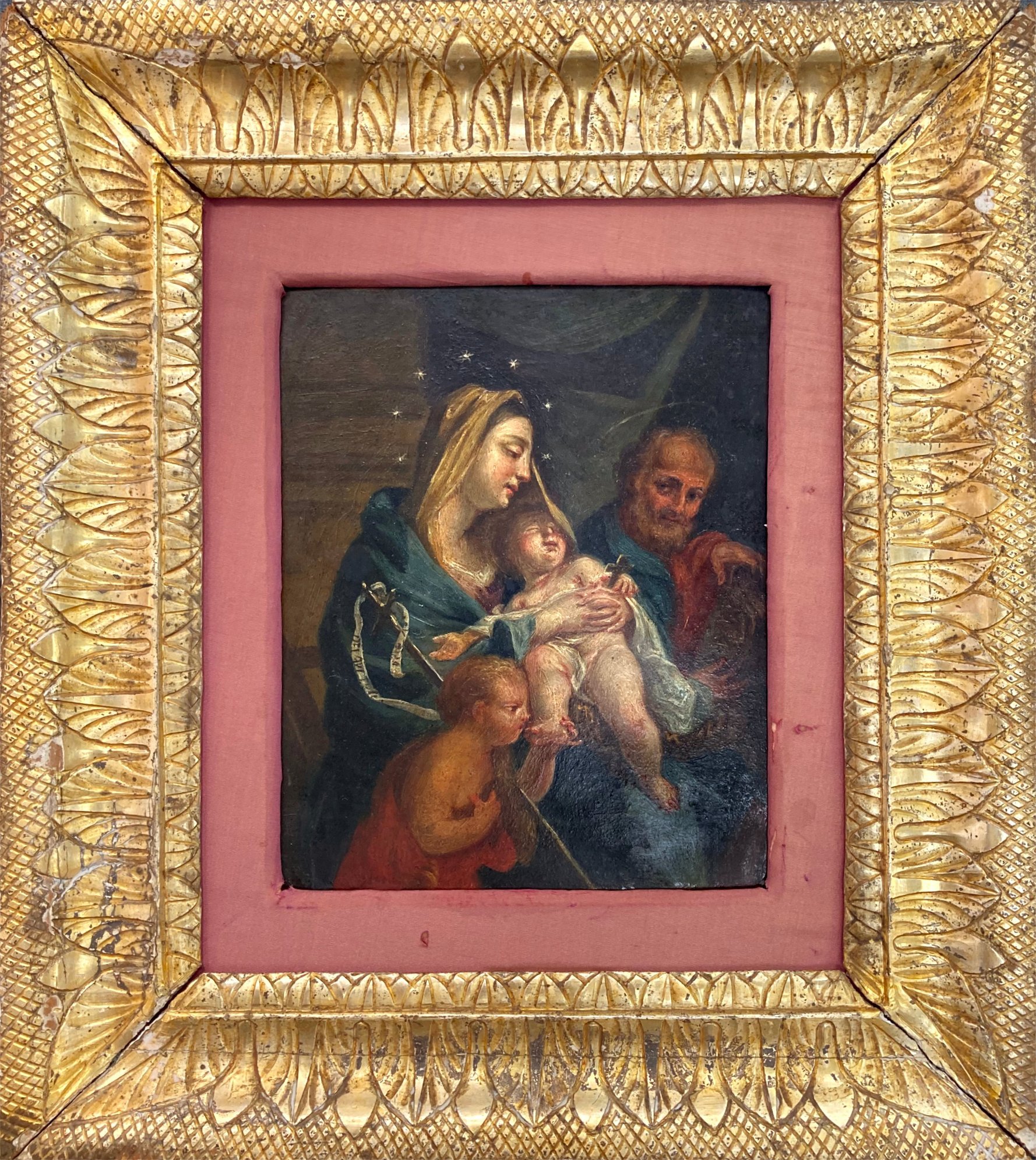 Dipinto ad olio su rame raffigurante Sacra Famiglia con San Giovannino. Su...