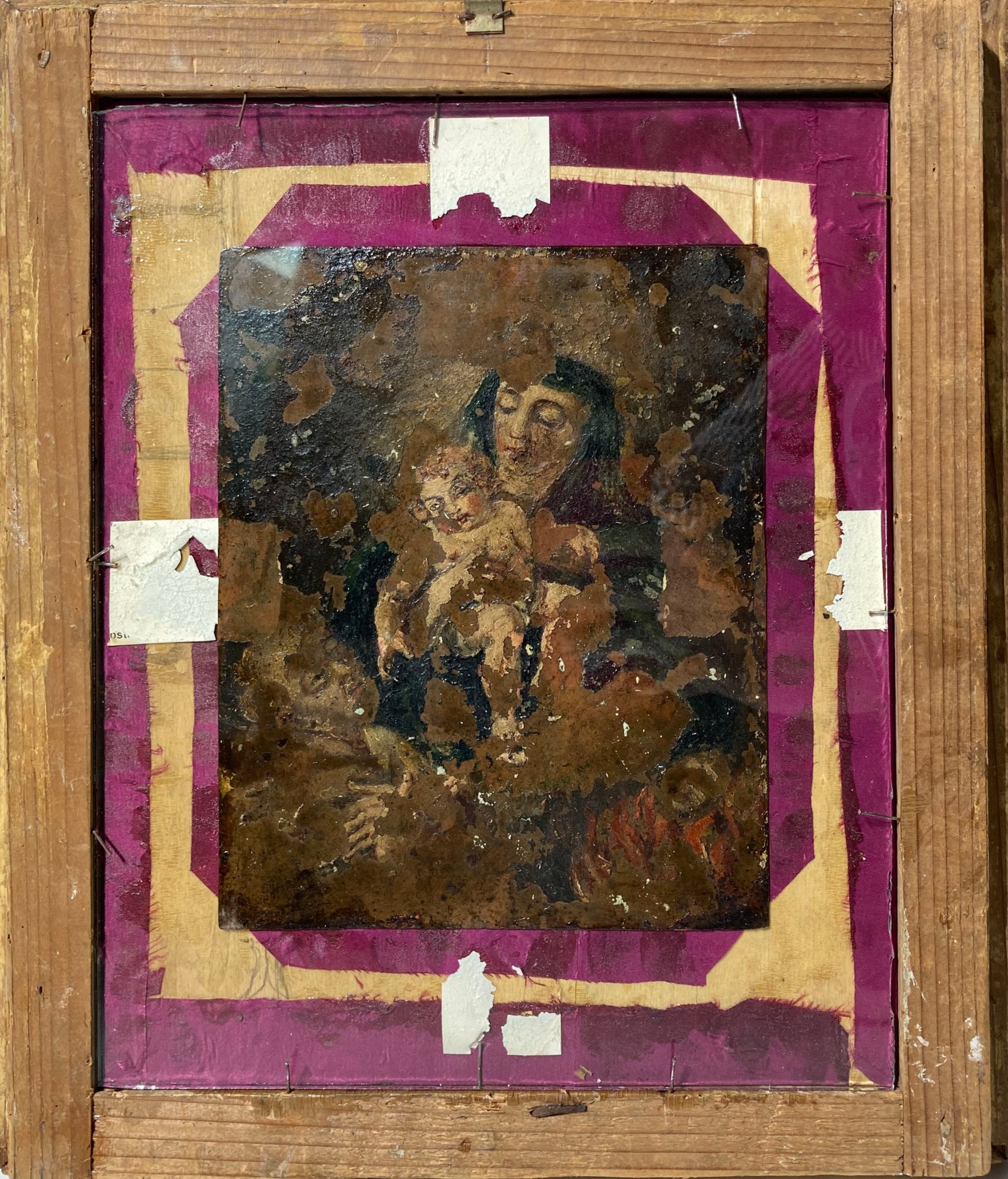 Dipinto ad olio su rame raffigurante Sacra Famiglia con San Giovannino. Su retro frammento ad olio più antico raffigurante Madonna con Bambino e San Giovannino. XVII/XVIII secolo. Cm 20x16. Misure in cornice 37x32.