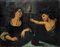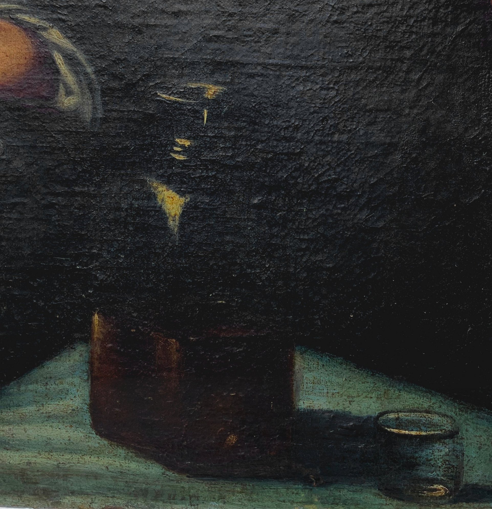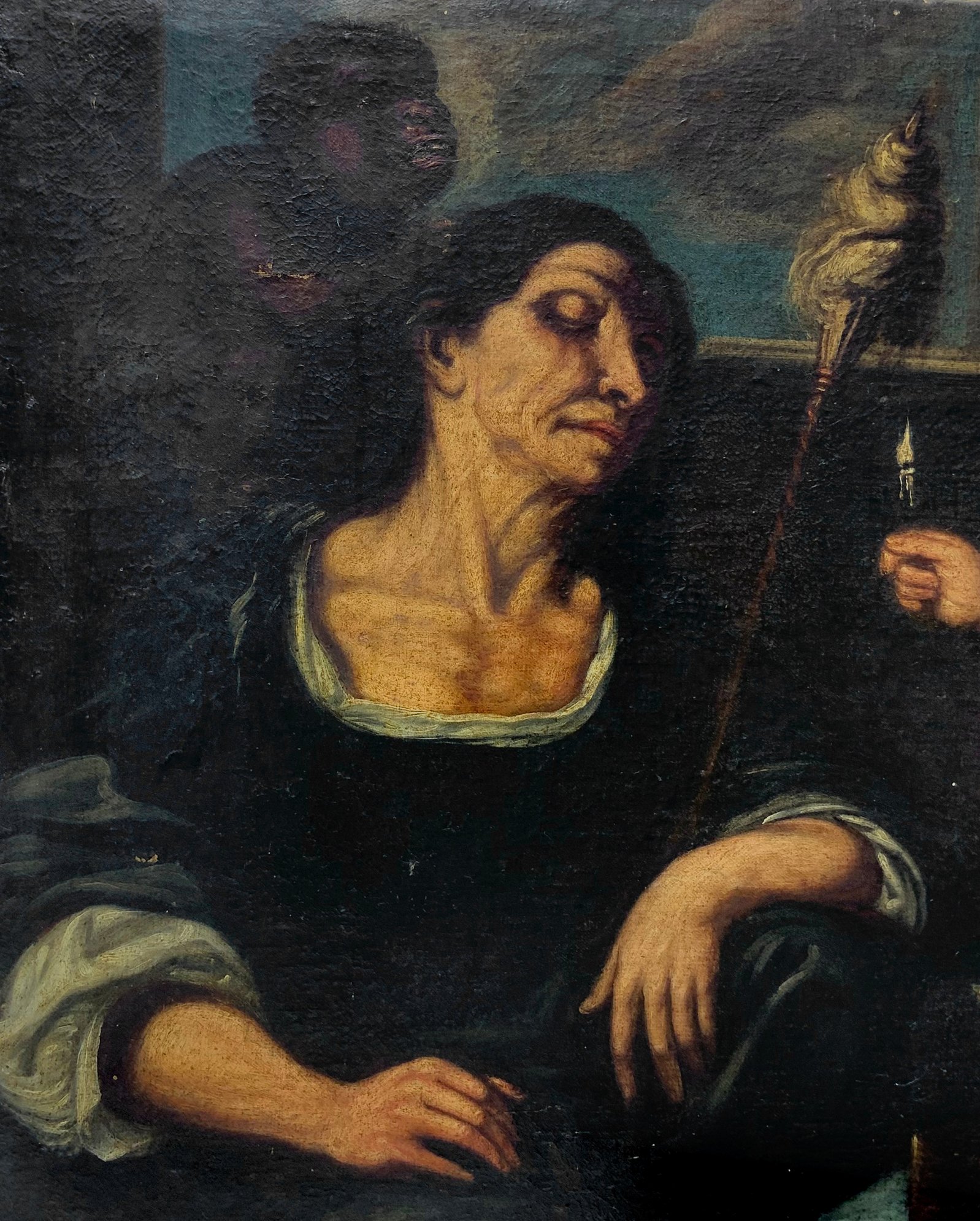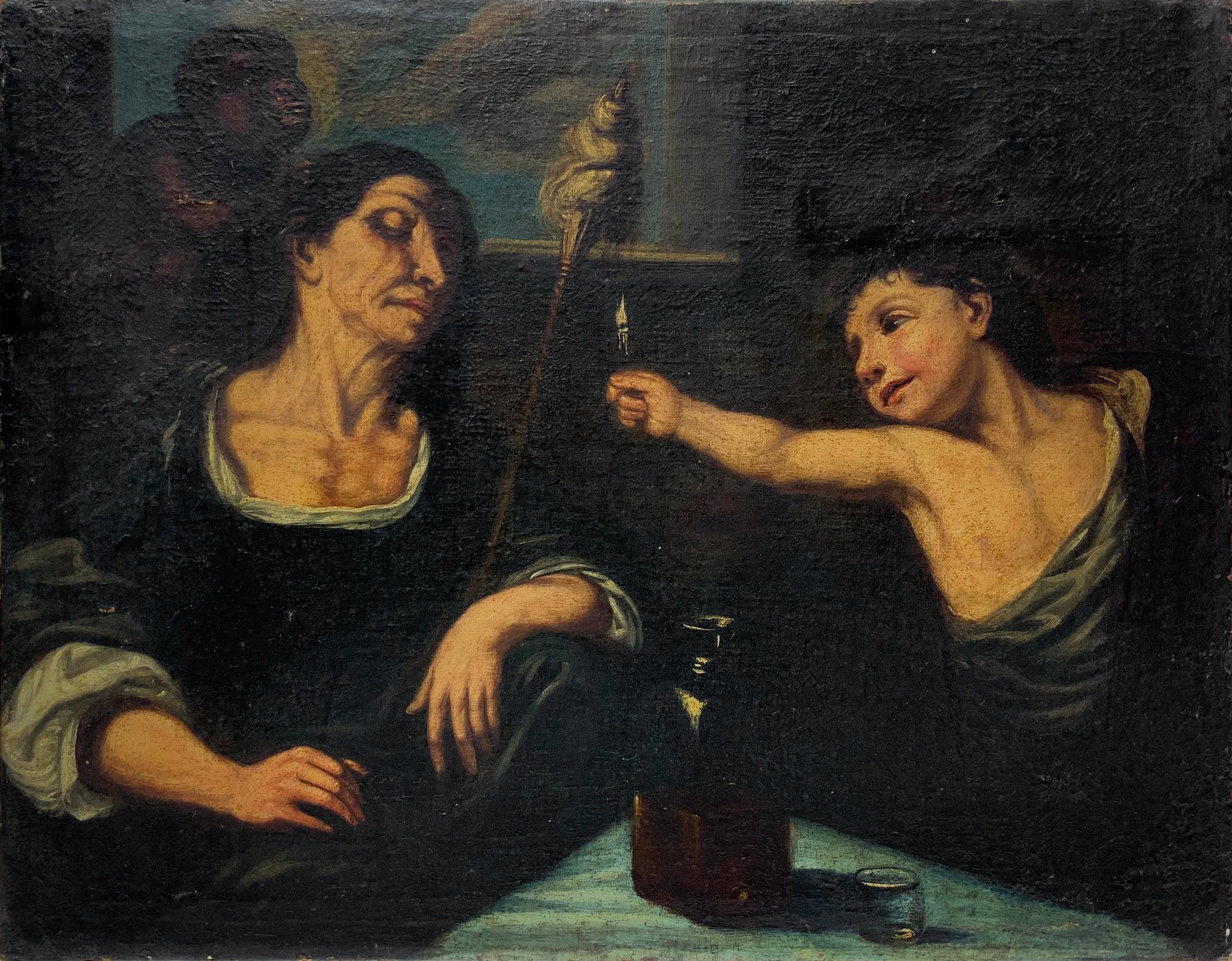 Dipinto ad olio su tela raffigurante Parca Cloto e ragazzo con candela, XVII...