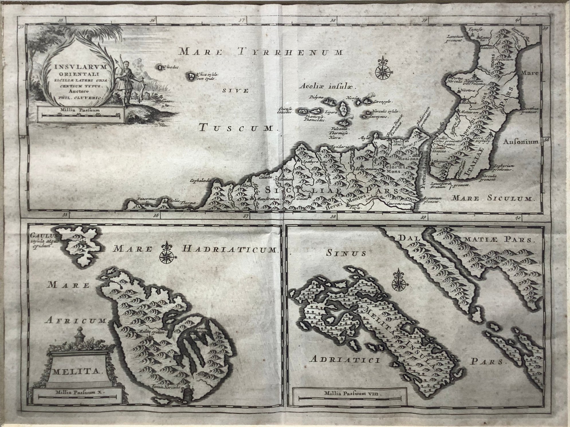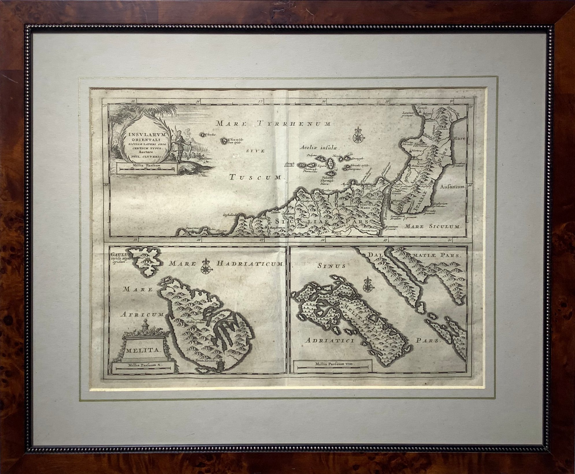 Insularum Orientali -Melita-Melita Insula, Leida, Sicilia-Malta, 1715, Vav Der AA Peter (Leida 1659-1733), tratto da Graevius Joannes Georgius “Tresaurus antiquitatum et istoriarum Italiae”. Cm 28,5x36, incisione in rame, bella carta divisa in tre sezioni – Malta- e MLjet l’isola Dalmata. In cornice Radica e oro Cm 47x55. Ottimo stato di conservazione.