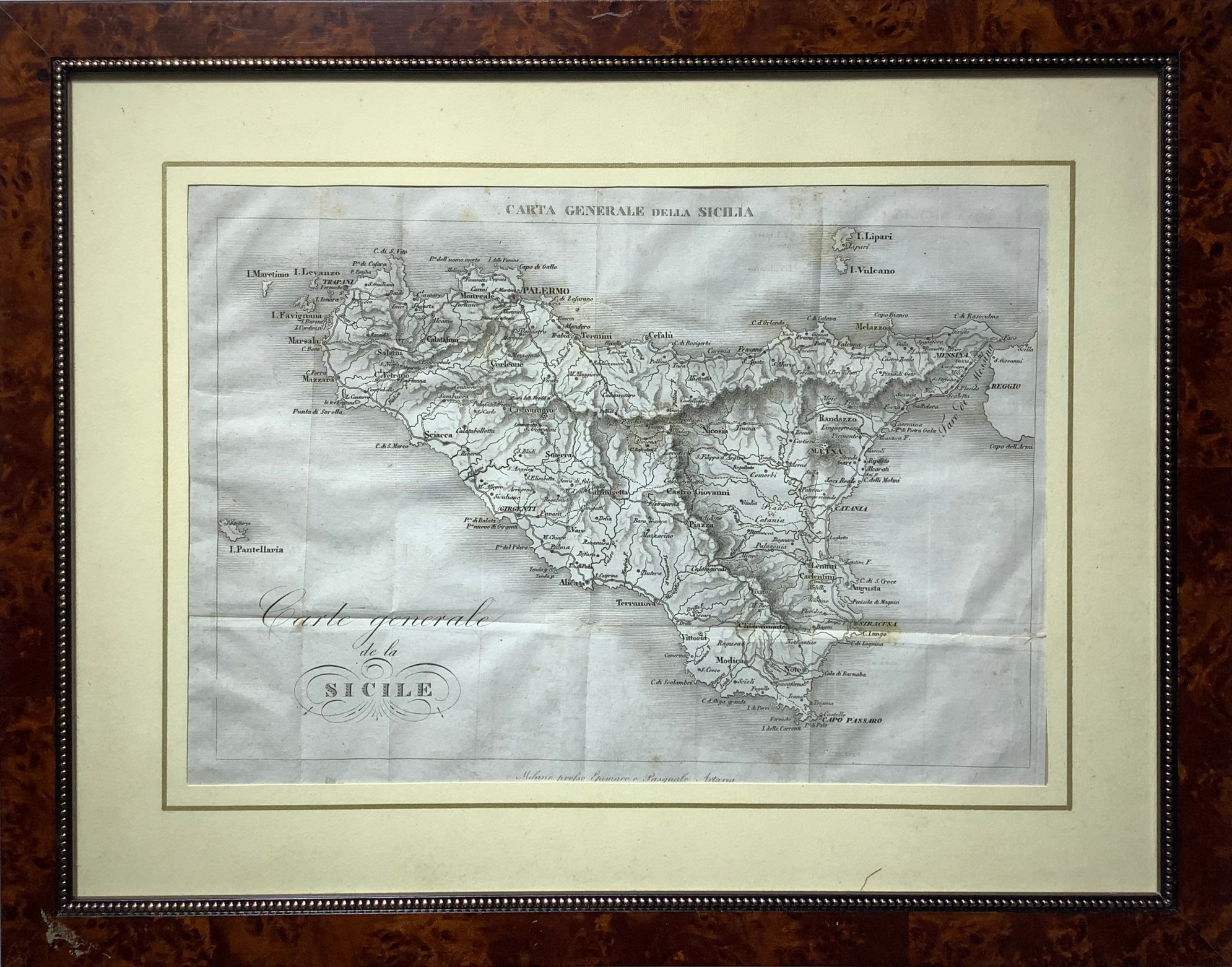 Carta generale della Sicilia, 1830, Milano, Epimaco e Pasquale Artaria, tratto da “Nuovissima guida dei Viaggiatori". Cm 25,5x36, incisione in rame. Con cornice in radica filettata in oro cm 41x51. Ottime condizioni.