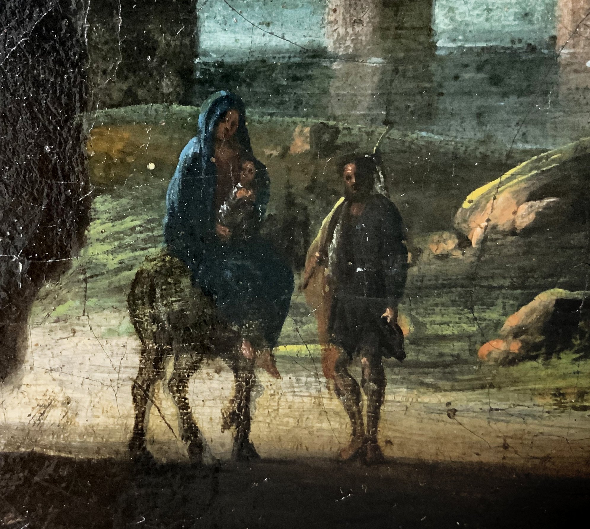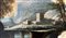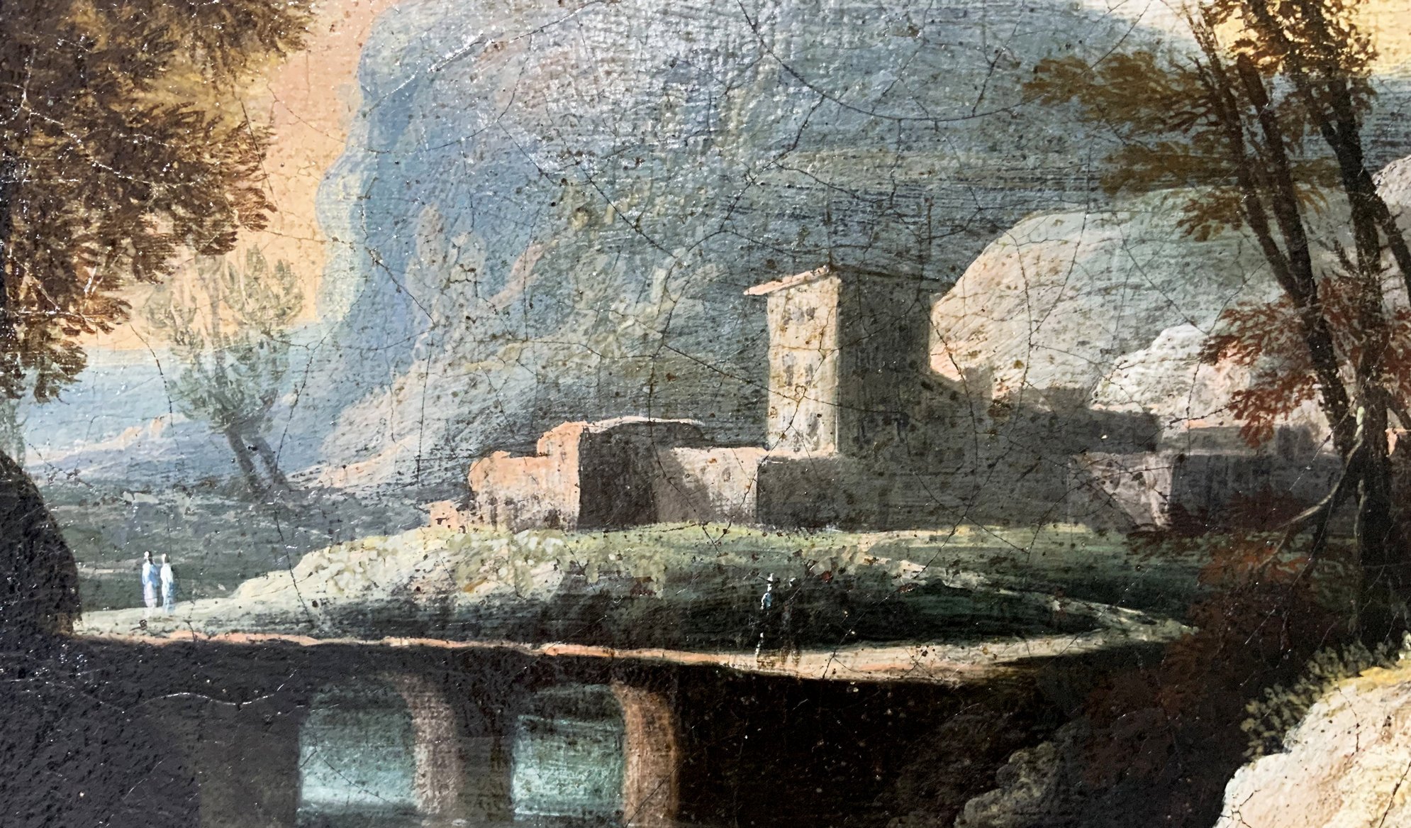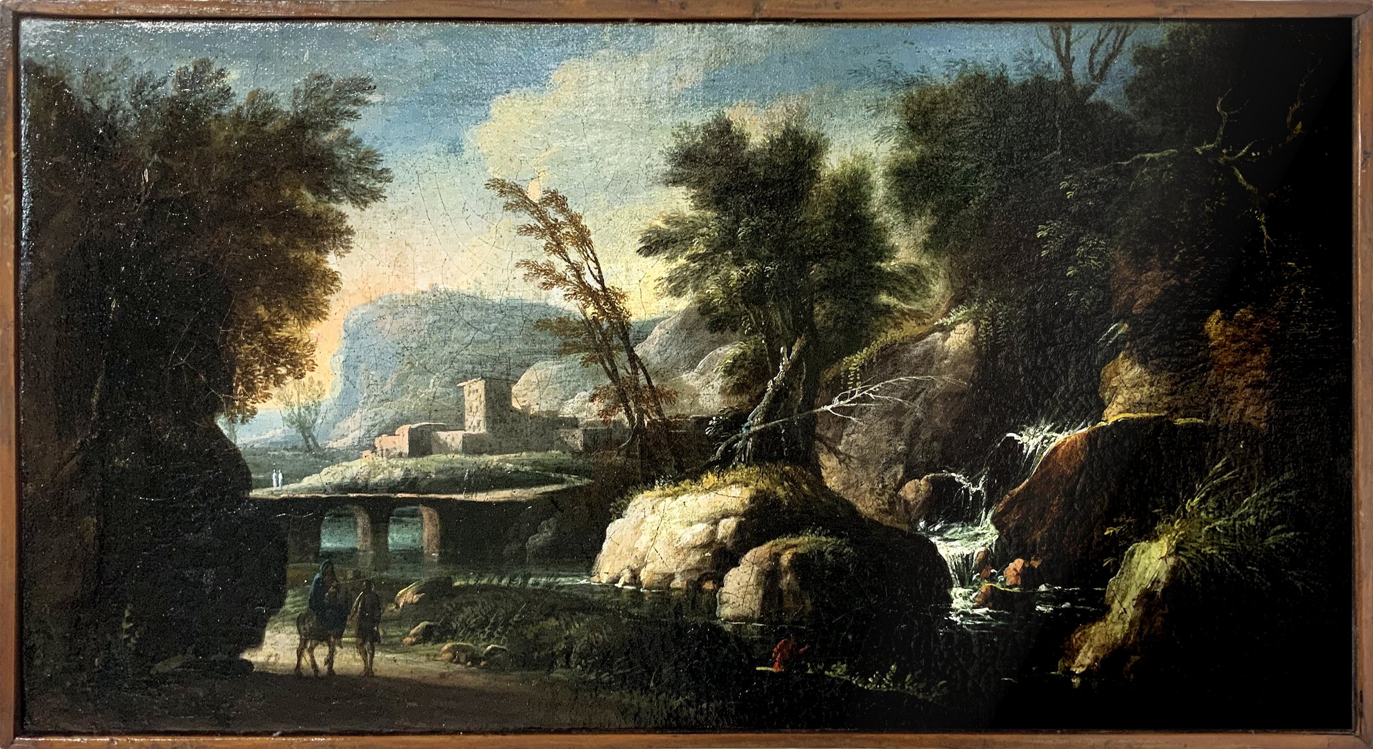 Dipinto ad olio su tela raffigurante paesaggio con rovina, pittore Italiano del XVIII secolo. Cm 27x50. Antica collezione Cotaio Cav. Fazio, fine secolo XIX.