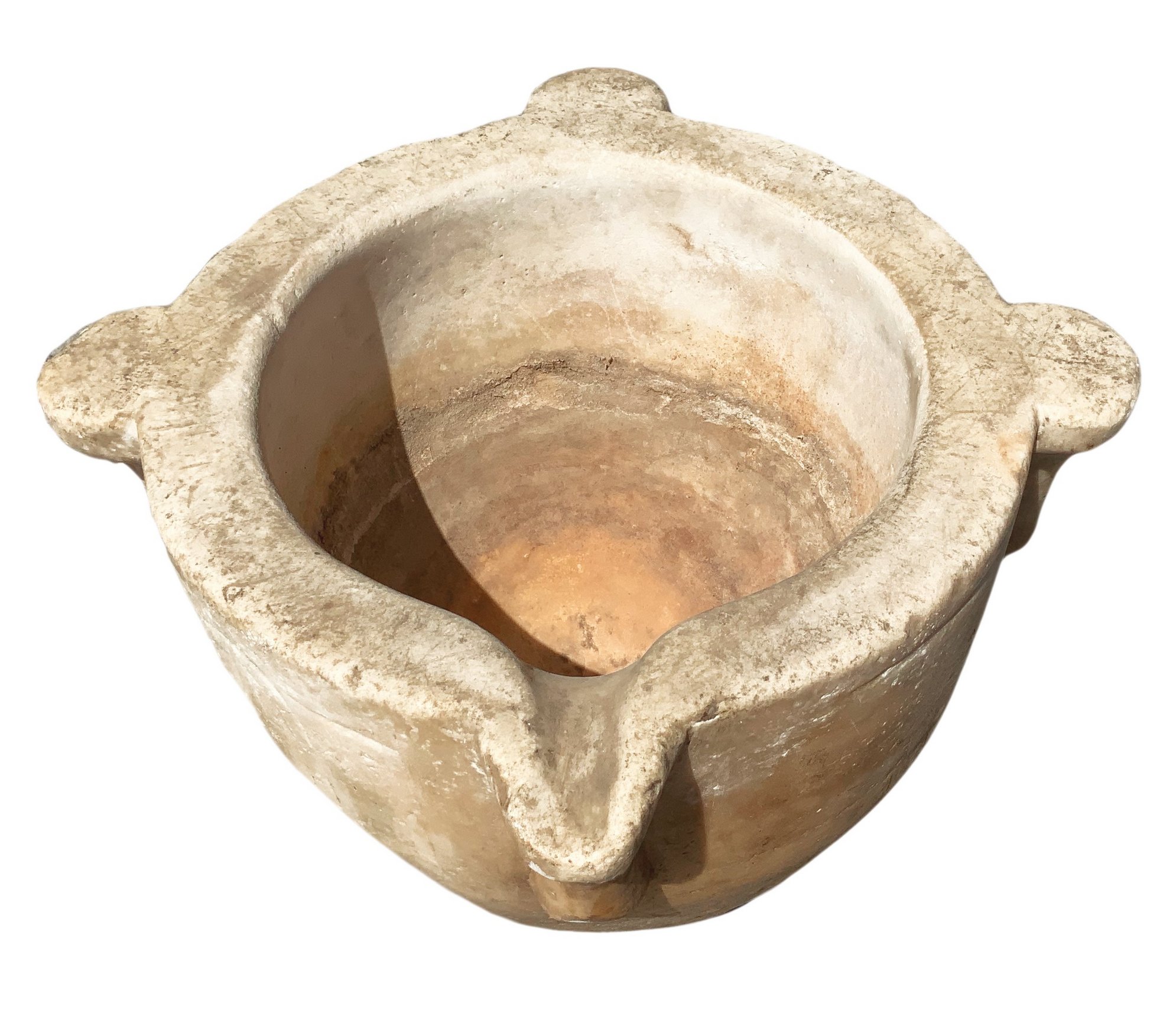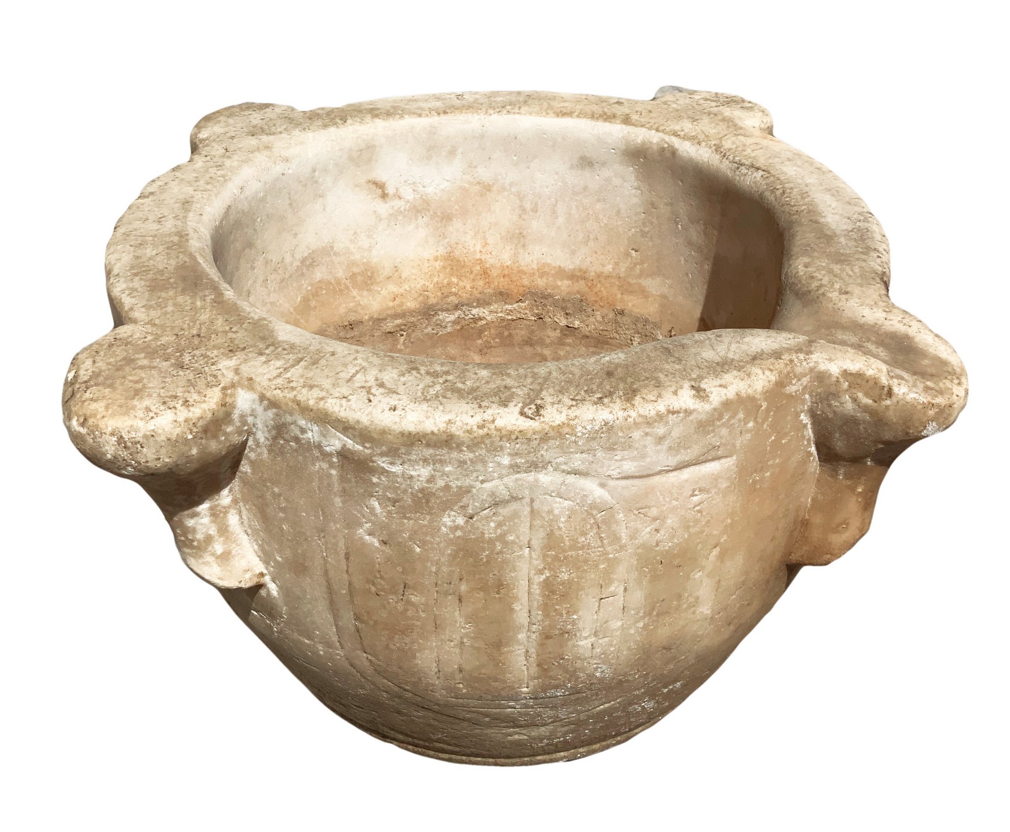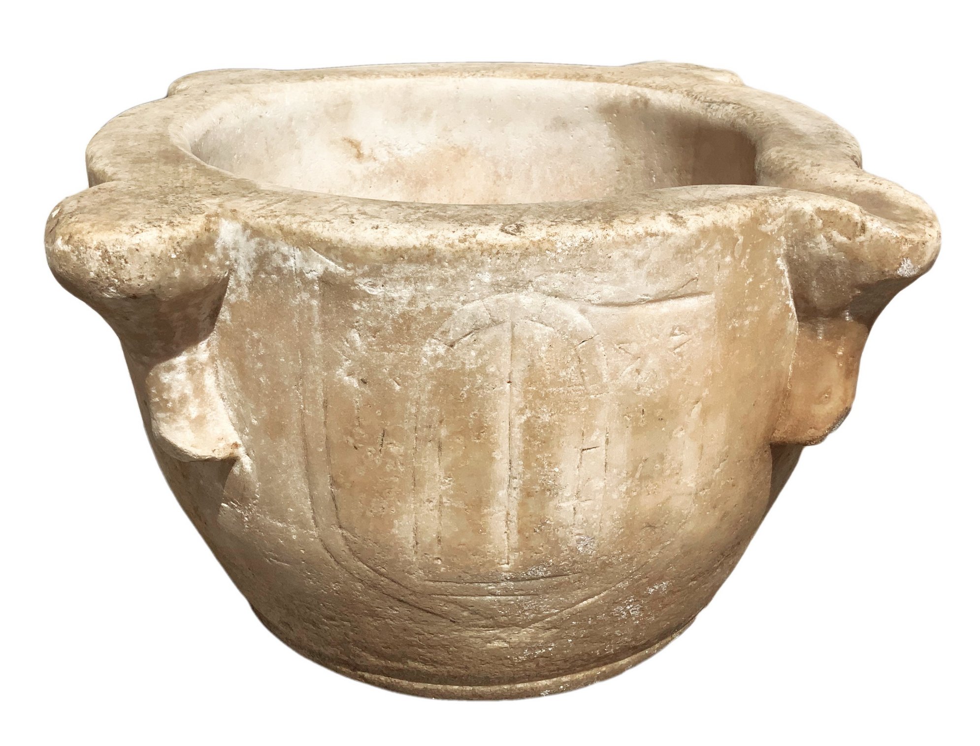Mortaio in marmo bianco, XVII secolo. Stemma nobiliare sul fronte. H cm 26x48, bocca cm 29.
