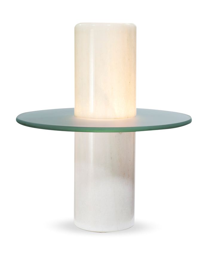 Grande lampada da tavolo composta da due elementi in marmo bianco e disco in vetro acidato di forte spessore.