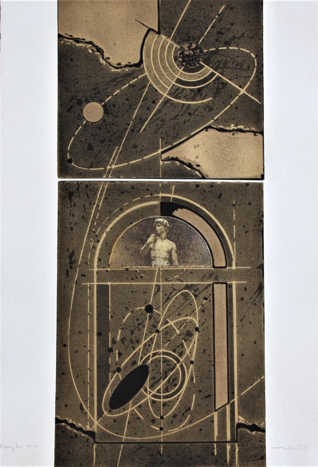 acquaforte su carta e collage, cm 58,5x25,5 su foglio cm 58,5x40; esemplare unico