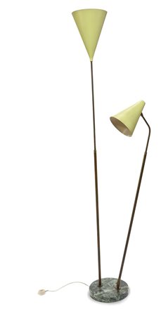 Riflettori in alluminio laccato, struttura in ottone. Base in marmo verde.