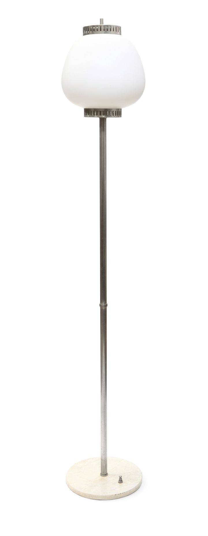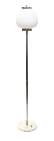 Lampada da terra con struttura in metallo nichelato spazzolato, base in marmo e diffusore in vetro opalino.