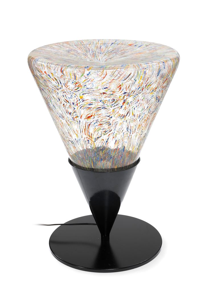 Lampada da tavolo con basamento in metallo laccato nero e diffusore conico decorato con murrine a cannette policrome.