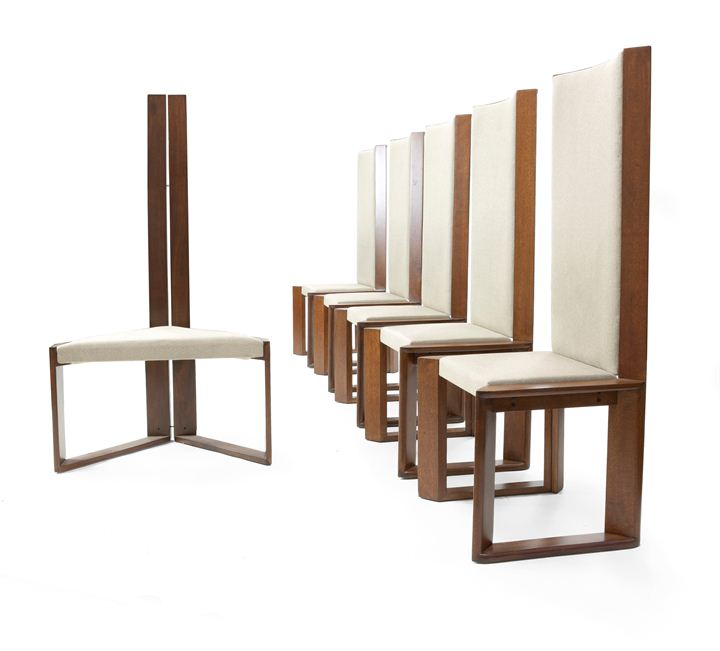 Sei sedie in legno tinto noce imbottite inn tessuto a righe. Il capotavola è a base triangolare.