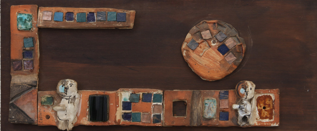 composizione a collage ceramica a ingobbio e smalti su legno cm 32x74 5
