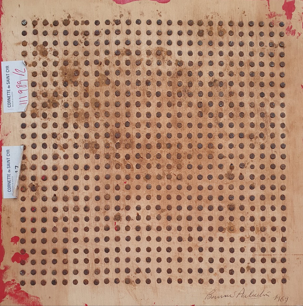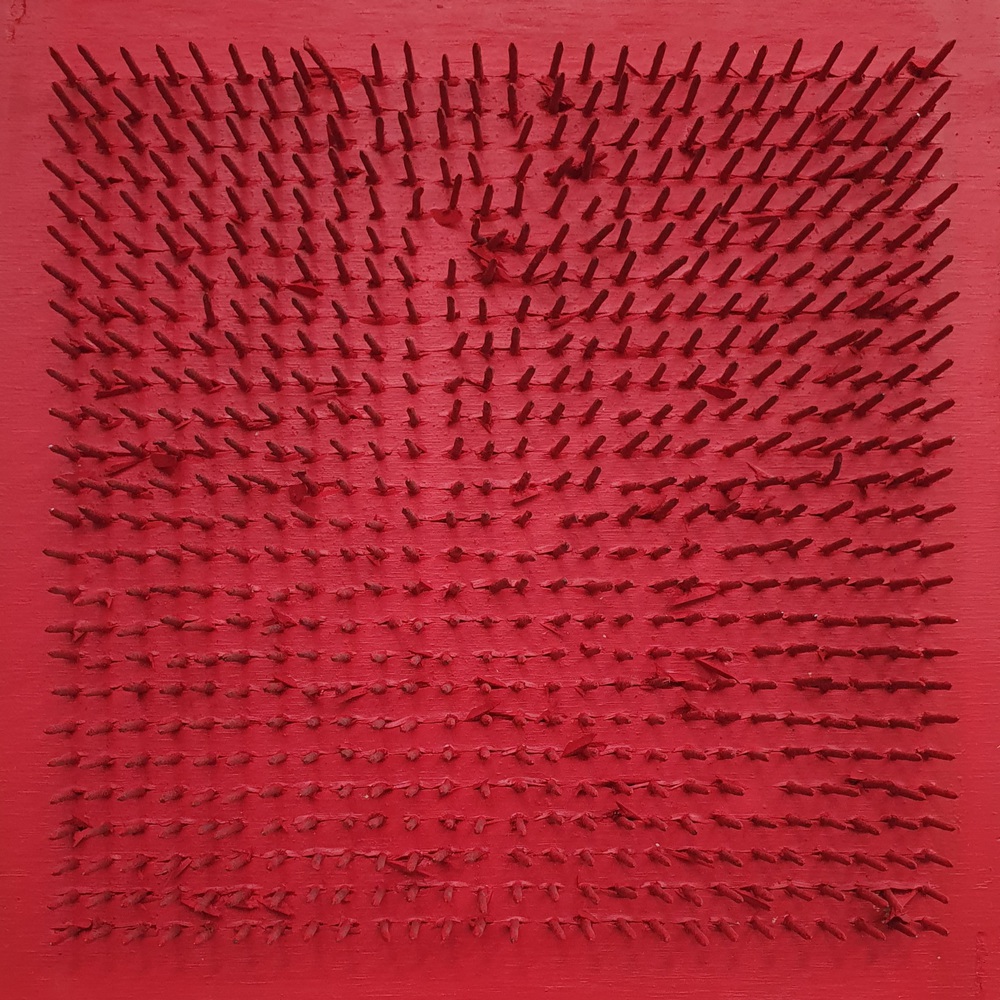 Chiodi e acrilico su tavola 30x30 cm; firma e anno al retro.