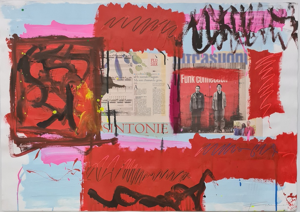 Acrilico e collage su carta 70x100 cm; firma in basso a destra.