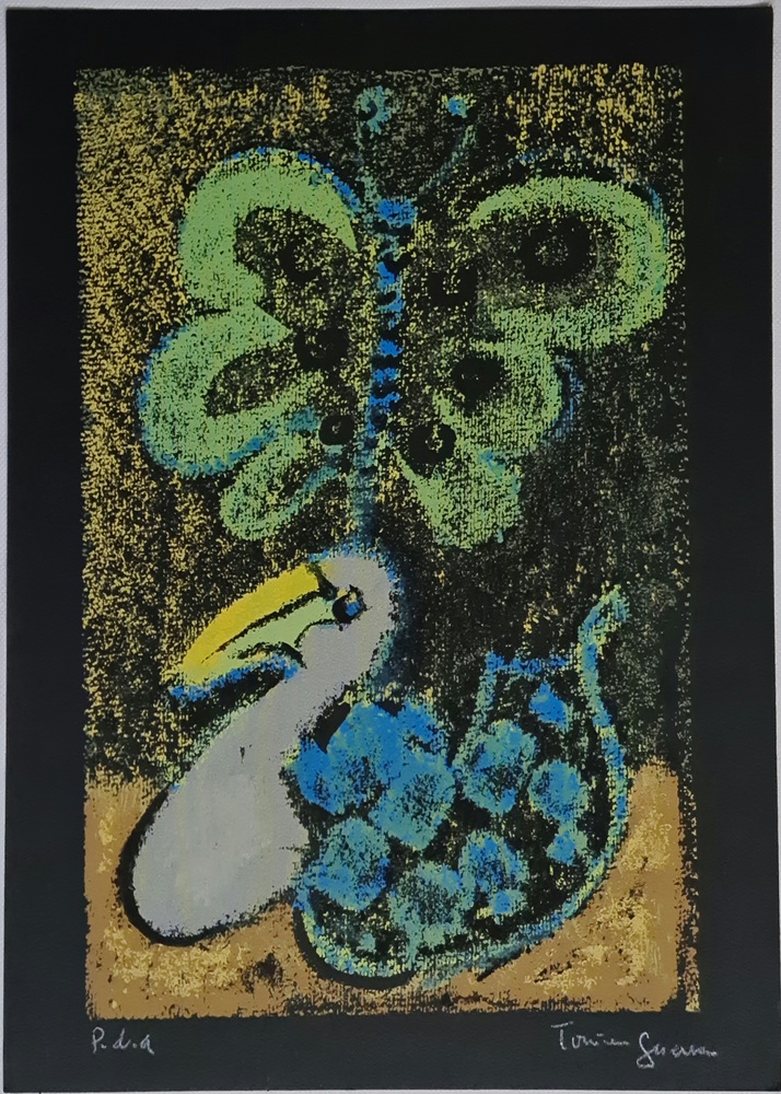 Serigrafia su cartoncino 50x35 cm; firma in basso a destra, tiratura in basso a sinistra p.d.a.