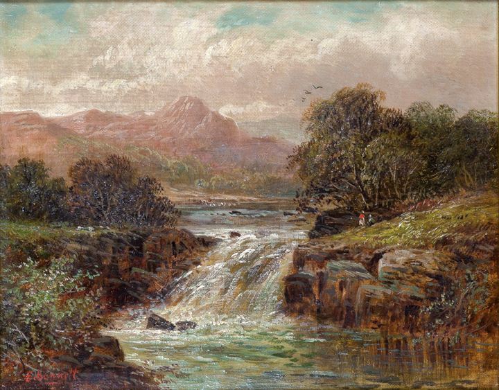BENNET E. "Paesaggio con cascata" 20x25 olio su tela Opera firmata in basso a...