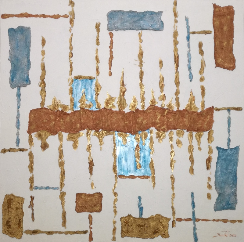 Acrilico con uso colori metallici oro e argento, con uso di garze, colla vinilica e pomice acrilica grezza