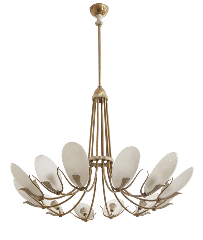 UN LAMPADARIO, anni '50. <br>Ottone, vetro