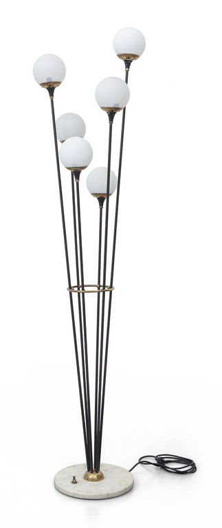 Marmo, tubo di ferro verniciato, ottone, vetro opalino satinato.