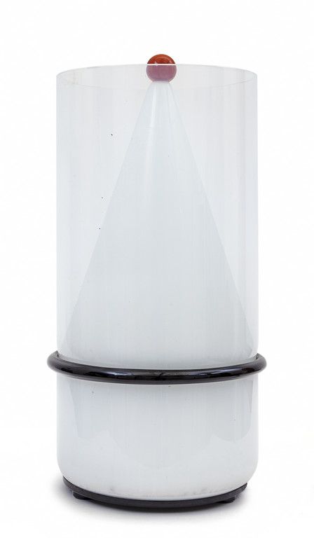 Cristallo fumato e vetro opalino con cintura di vetro nero e sfera di vetro rosso.