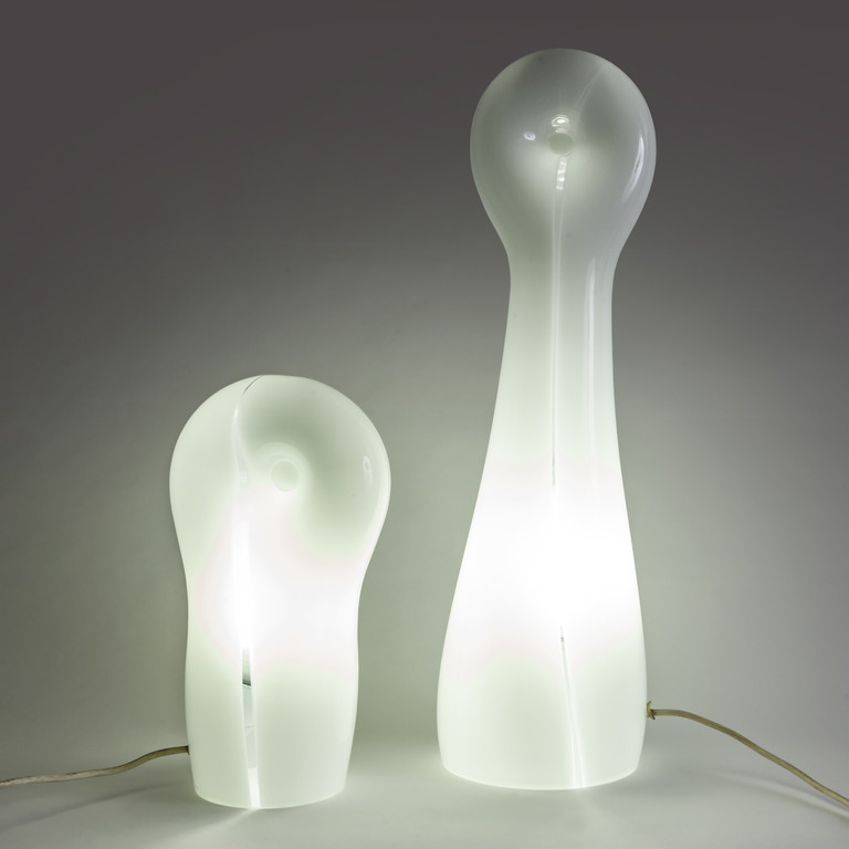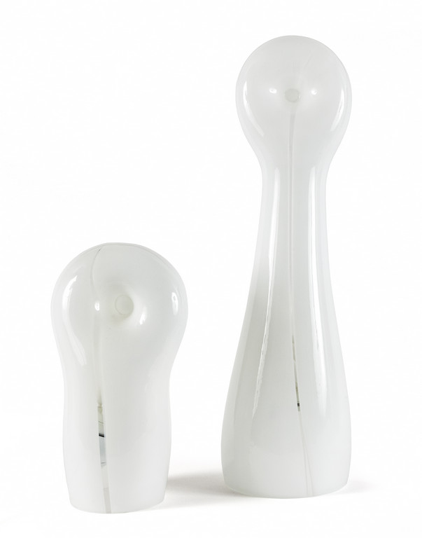 Due lampade da tavolo in vetro opalino soffiato.