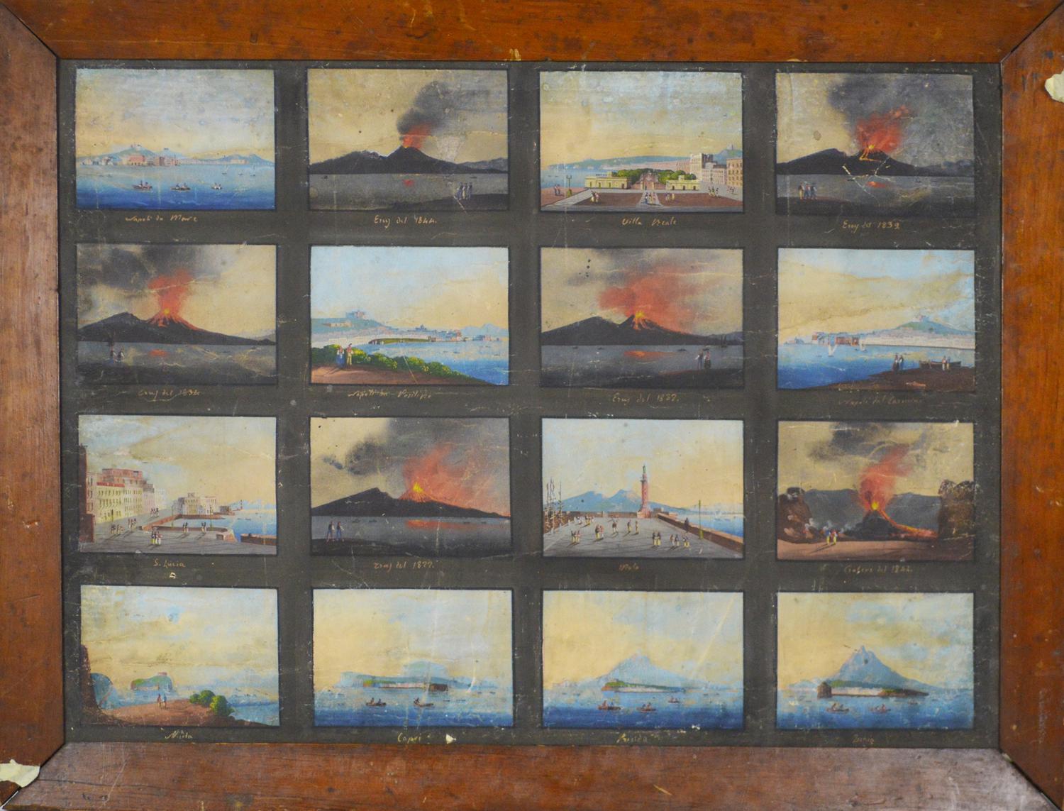 Scuola Napoletana del XIX secolo SEDICI VEDUTE DEL VESUVIO tempera su carta,...
