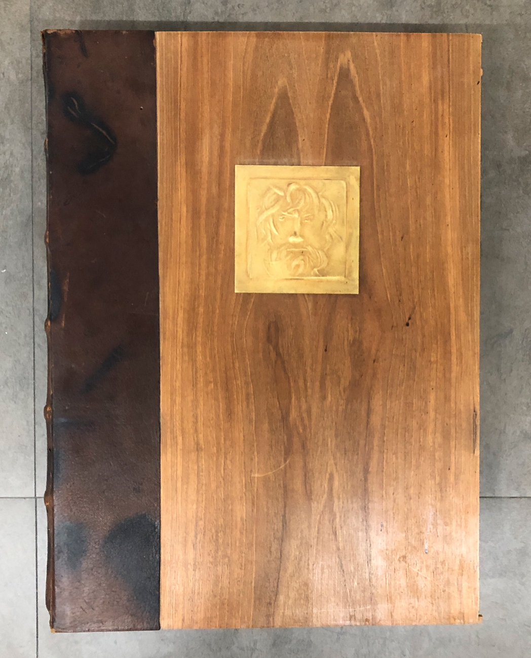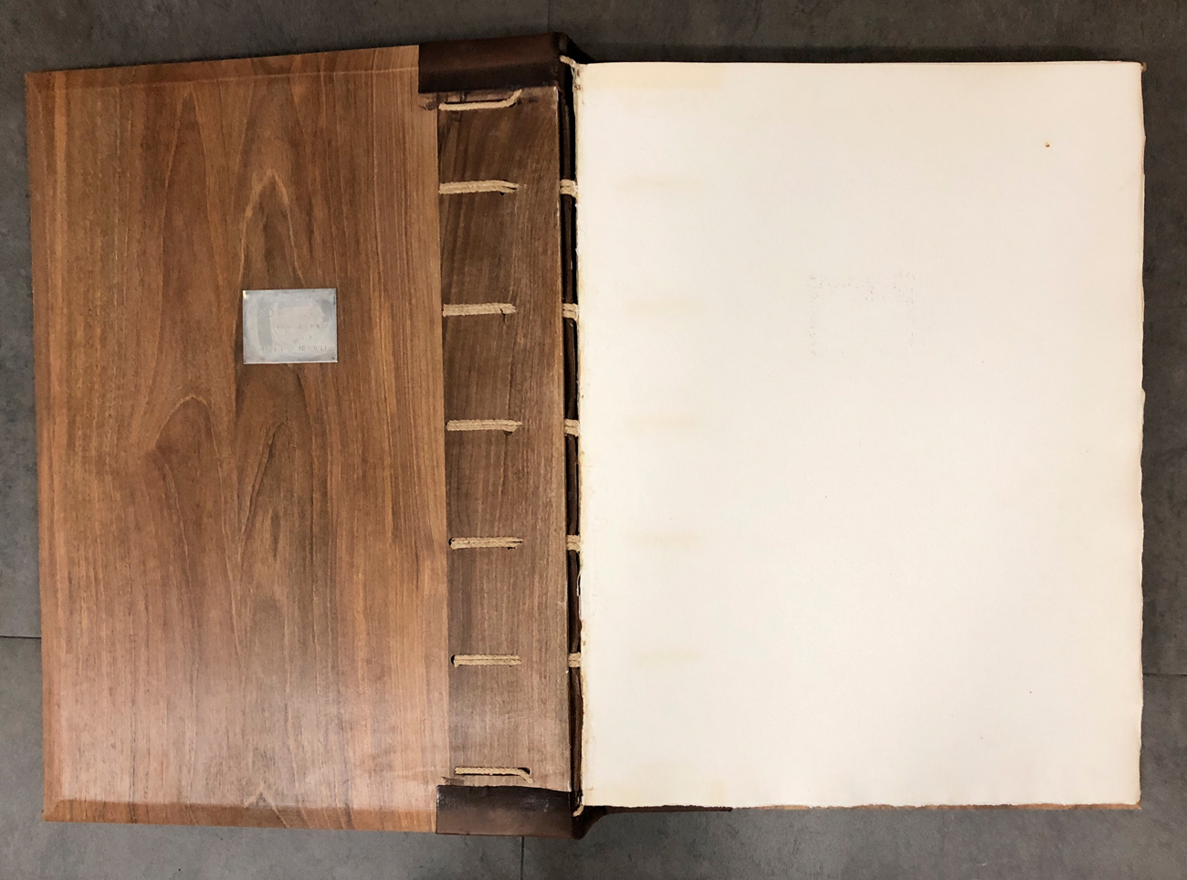 Volume in carta fabbricata a mano nelle cartiere Miliani/Fabriano con legatura artigianale 'alla cappuccina' e iscrizioni e fregi in oro fino riportati manualmente