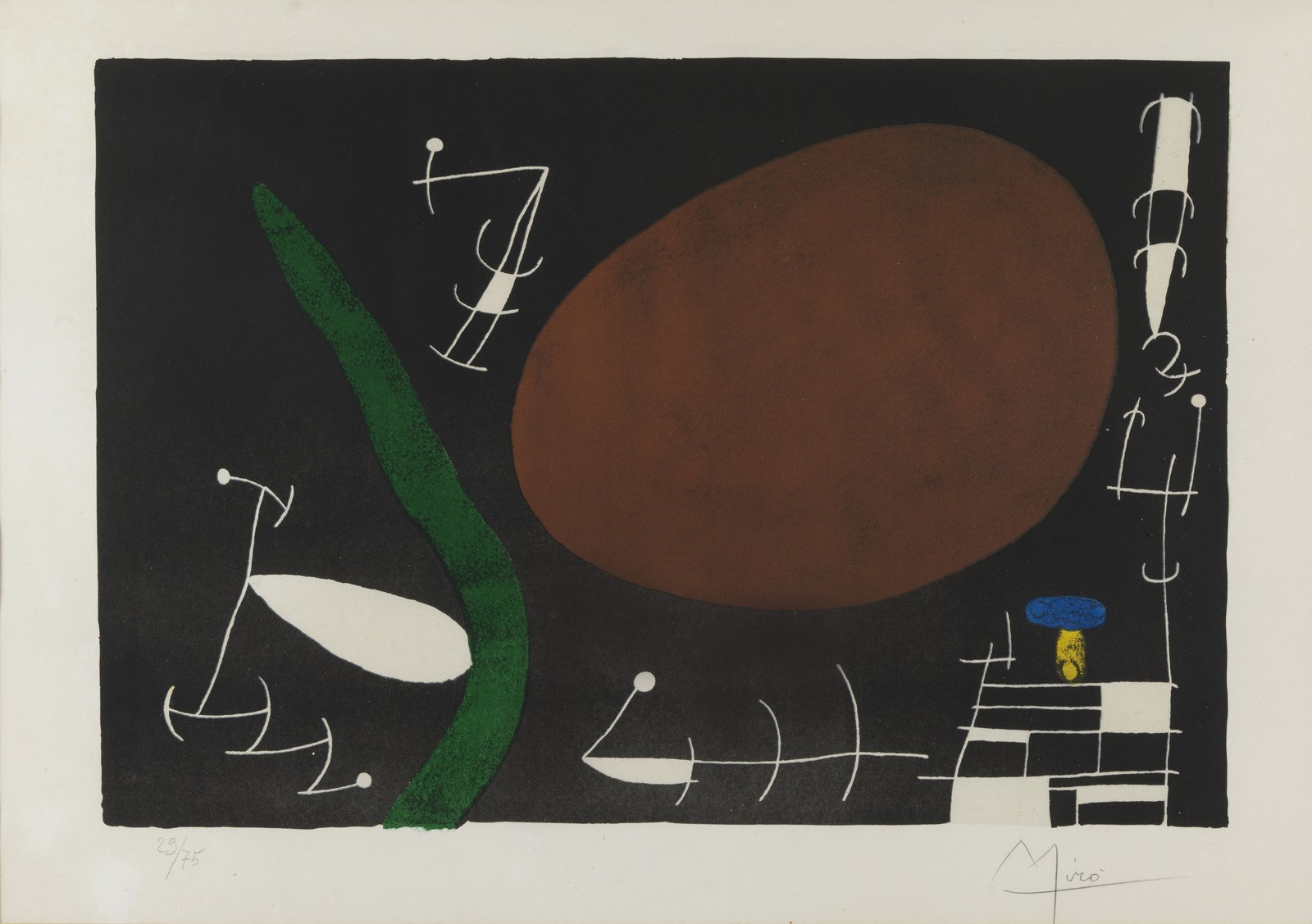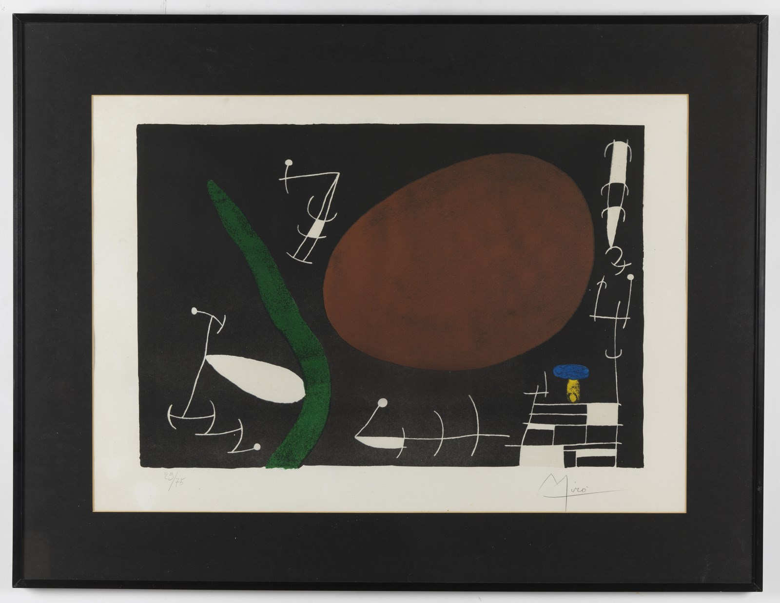 MIRO' JOAN (1893 - 1983) Senza titolo. Litografia. Cm 76,00 x 57,00. 29/75. Tiratura e firma in basso a matita. Al retro cartiglio Studio F22, Palazzolo. Cornice presente