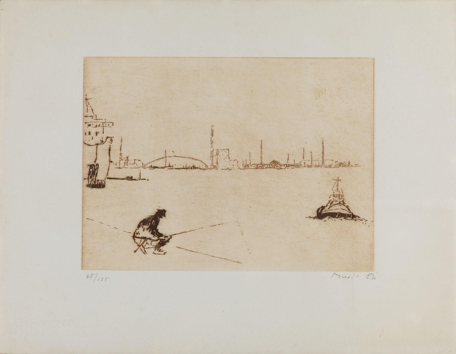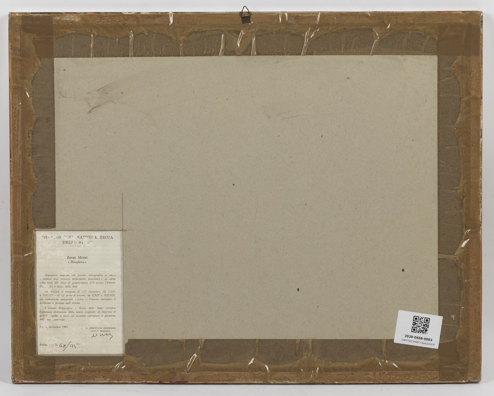 MUSIC ANTONI ZORAN (1909 - 2005) Marghera. 1983. Acquaforte. Cm 51,00 x 40,00. 68/125. Tiratura, firma e anno in basso a matita. Timbro a secco Società Italiana per le Edizioni d'Arte, Roma in basso a sinistra. Dimensione lastra: 24x32 cm. Carta Velin Cuve bkf rives. Edizione totale: 125 esemplari numerati da 1/125 a 125/125; 12 prove di torchio, da I/XII a XII/XII, con indicazione autografa p.d.a. Ciascun esemplare è firmato e numerato dall'artista. Timbro a secco Istituto Poligrafico e Zecca dello Stato. Certificato di autenticità e provenienza Società Italiana per le Edizioni d'Arte. Cornice presente
