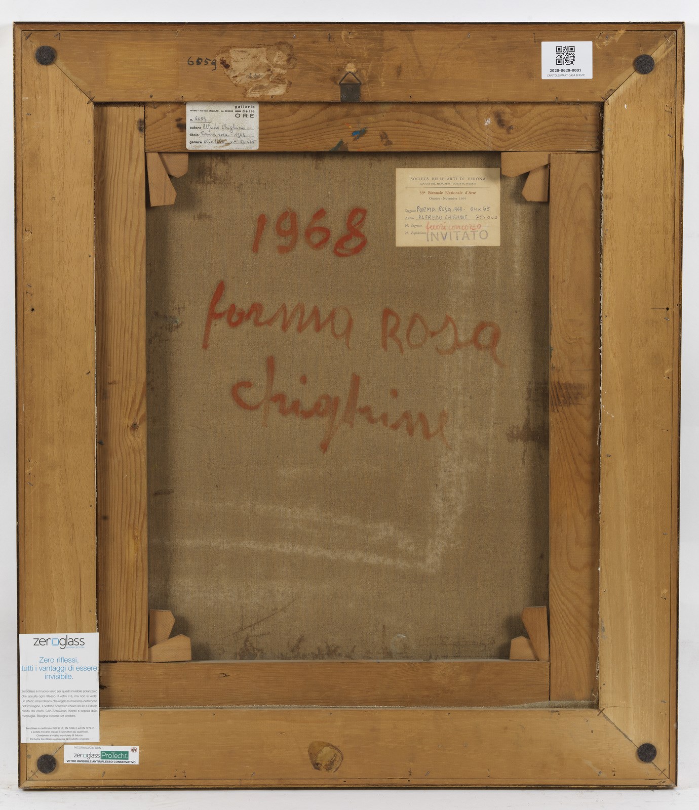 CHIGHINE ALFREDO (1914 - 1974) Forma rosa. 1968. Olio su tela . Cm 54,00 x 65,00. Al retro titolo, firma e anno. Cartiglio descrittivo Galleria delle Ore, Milano; etichetta della 59° Biennale Nazionale d'Arte, Ottobre -Novembre 1969. Provenienza: Galleria Marini, Milano. Collezione privata, Milano. Cornice presente