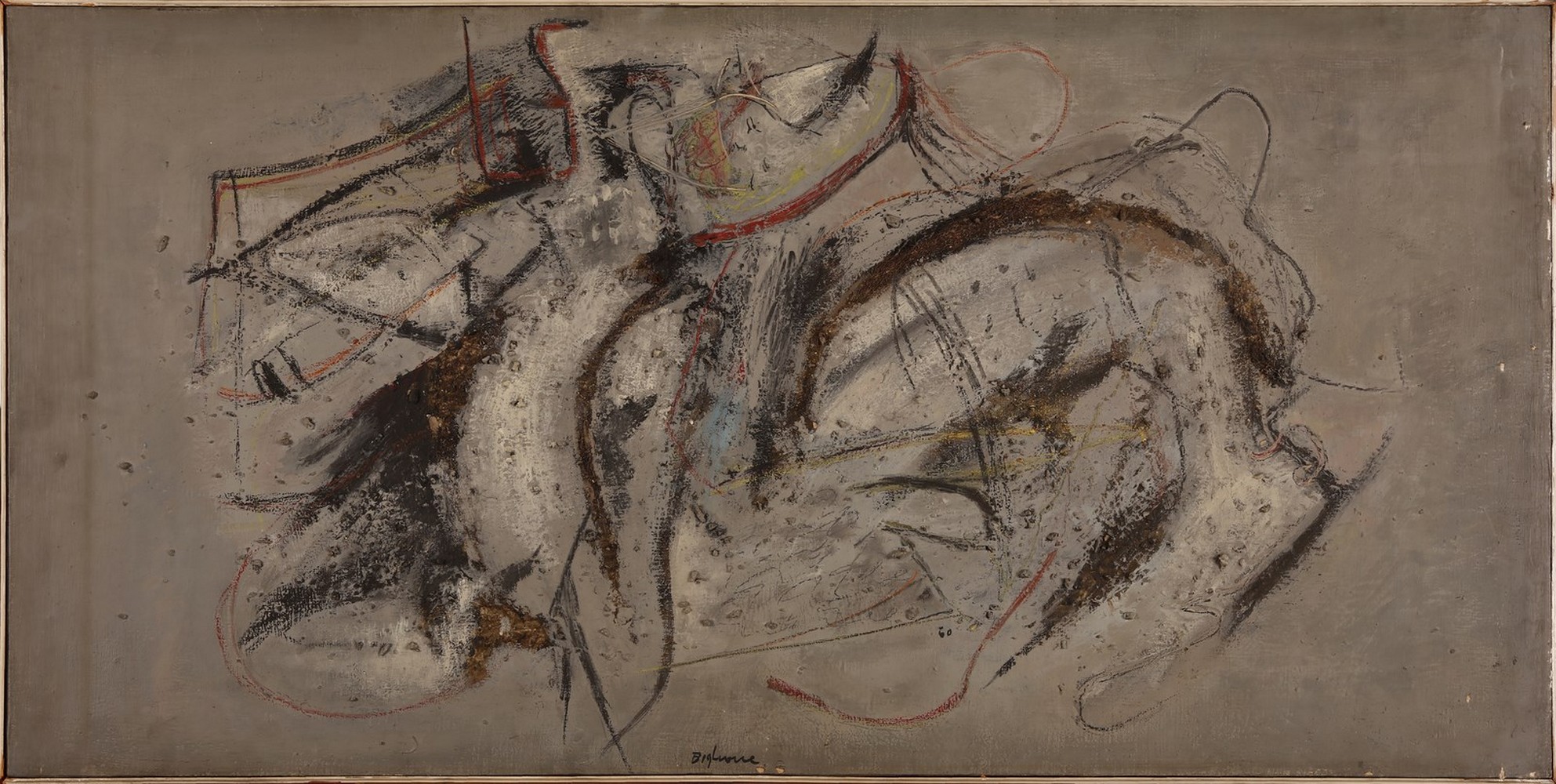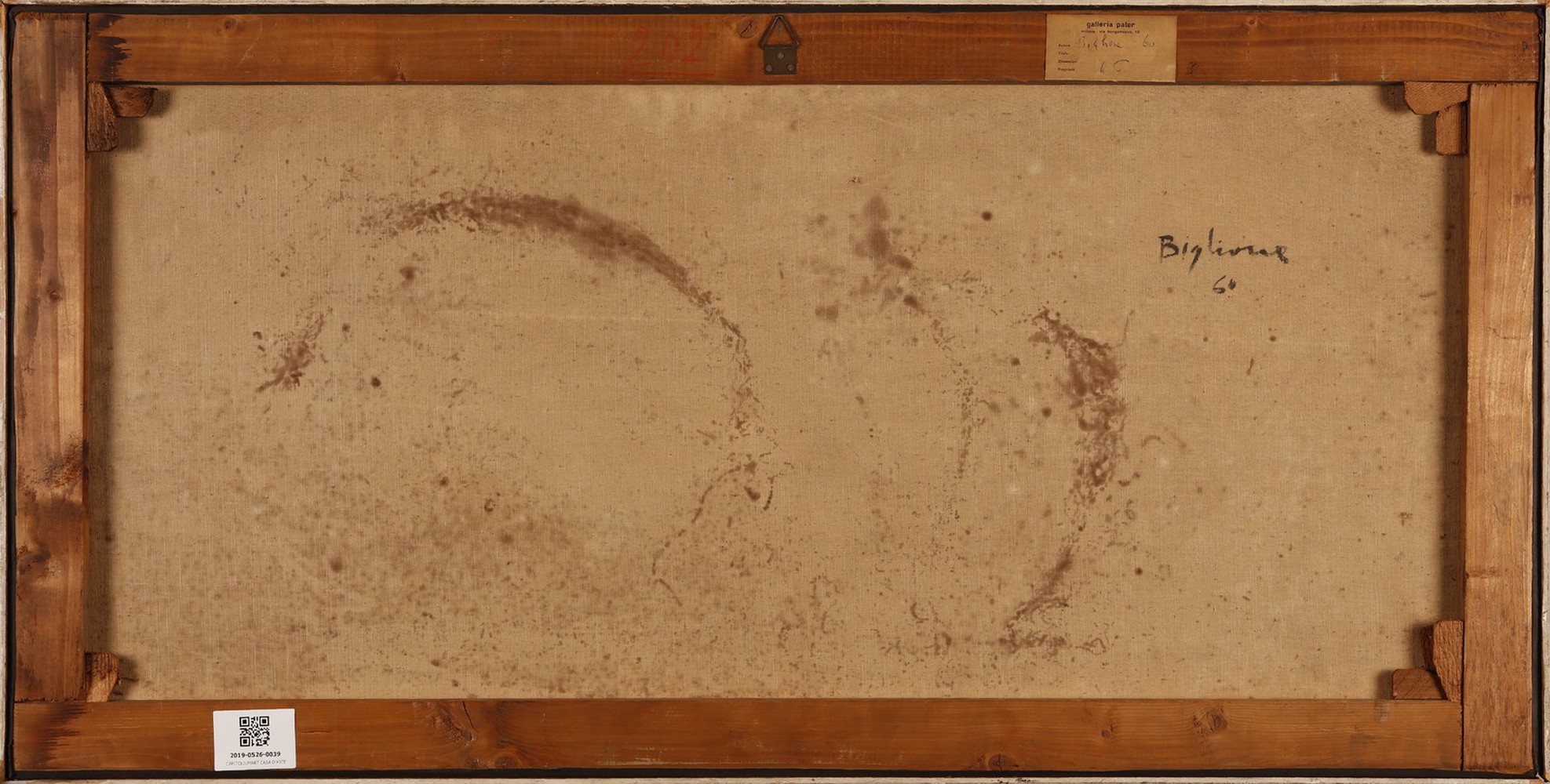 BIGLIONE ANNIBALE (1923 - 1981) Senza titolo. 1960. Olio su tela . Cm 100,00 x 50,00. Firma in basso al centro. Al retro firma, anno e cartiglio Galleria Pater, Milan. Provenienza: Meeting Art, Vercelli. Presenti difetti.