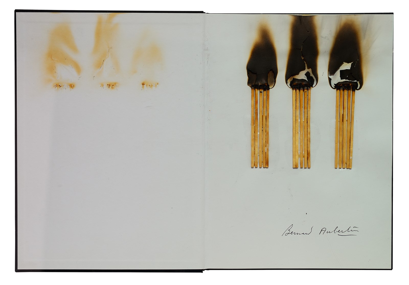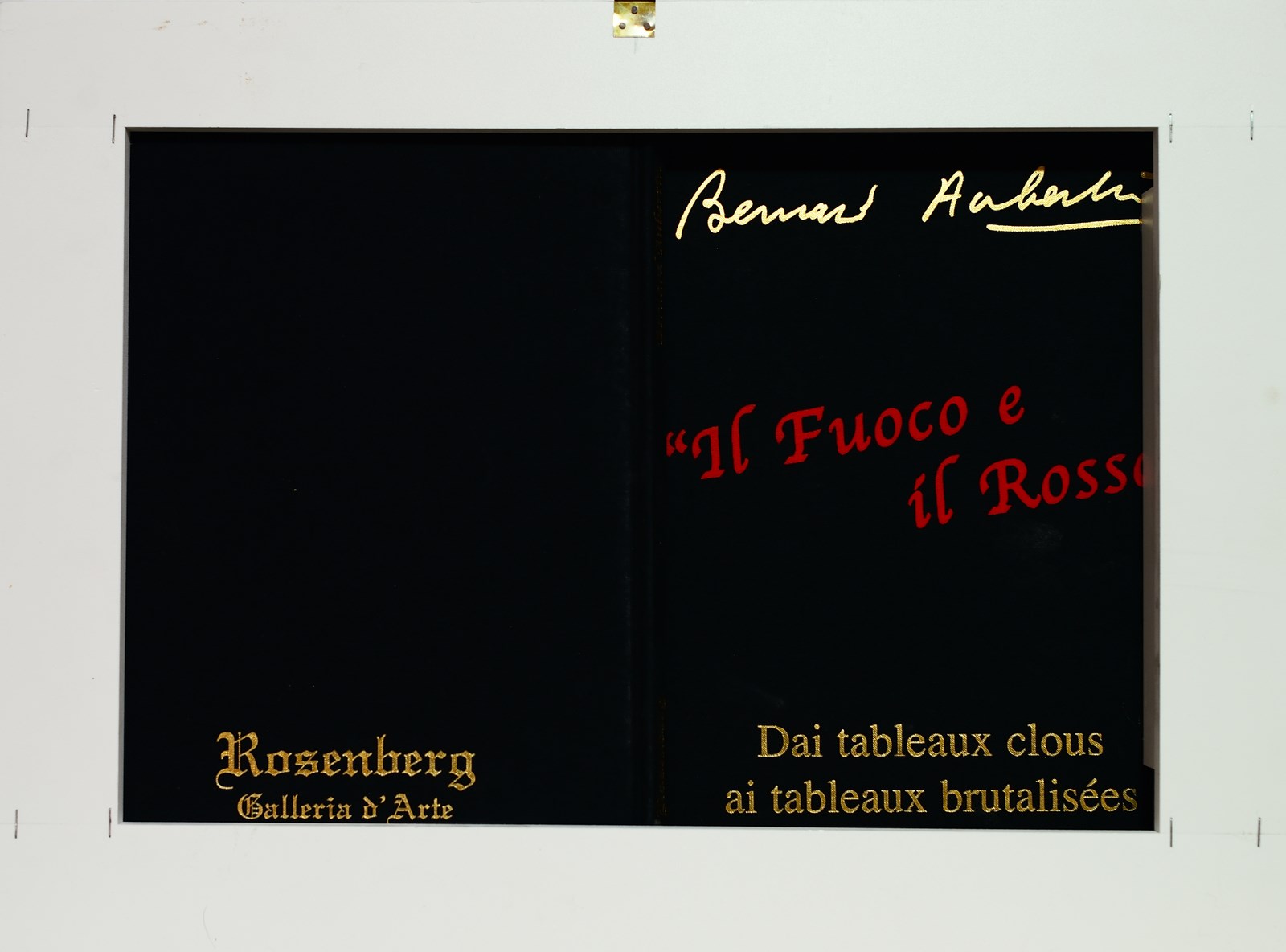 AUBERTIN BERNARD (1934 - 2015) Il fuoco e il rosso. Fiammiferi bruciati su catalogo. Cm 45,00 x 30,00. Firma in basso a destra. Ed. Galleria Rosenberg, Milano. "Dai tableaux clous ai tableaux brutalisées". . Cornice presente