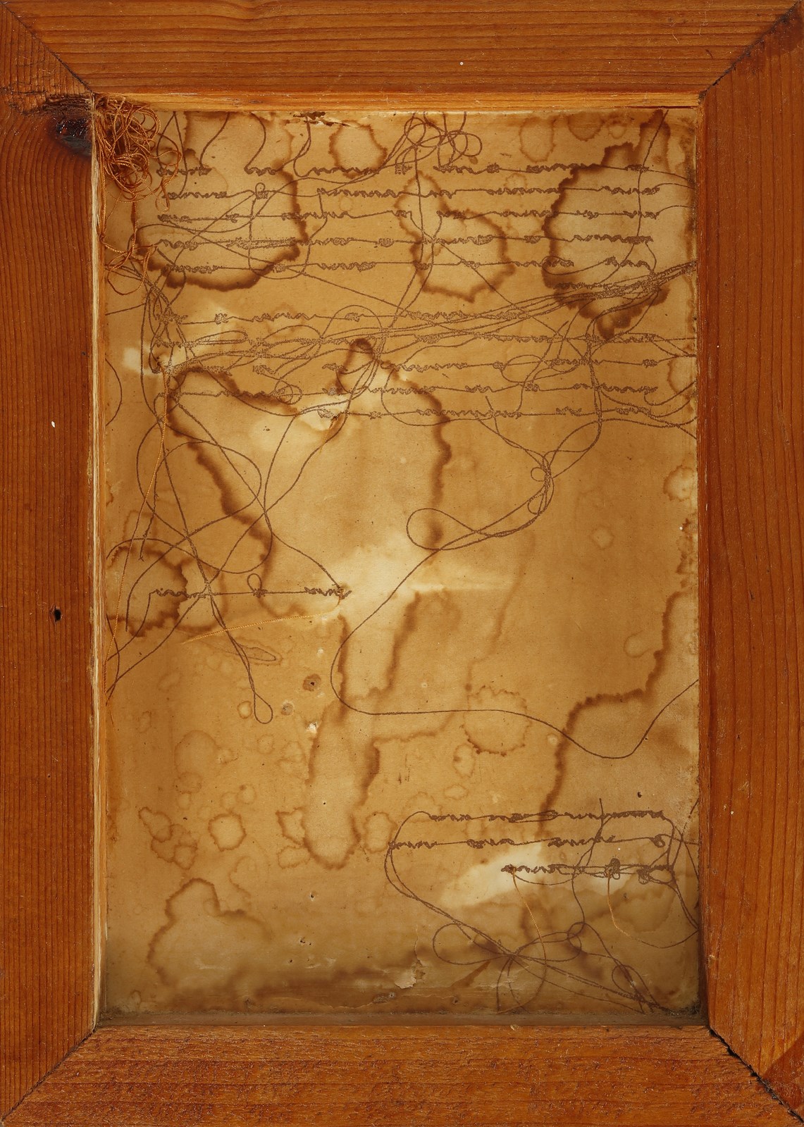 LAI MARIA (1919 - 2013) Senza titolo. 1982. Xerografia con intervento in filo. Cm 15,50 x 22,00 x 2,00. Al retro firma, anno e dedica. Opera archiviata presso l'Archivio Maria Lai, Lanusei come da documentazione fotografica allegata all'opera riportante il relativo numero d'inventario. Lievi difetti.