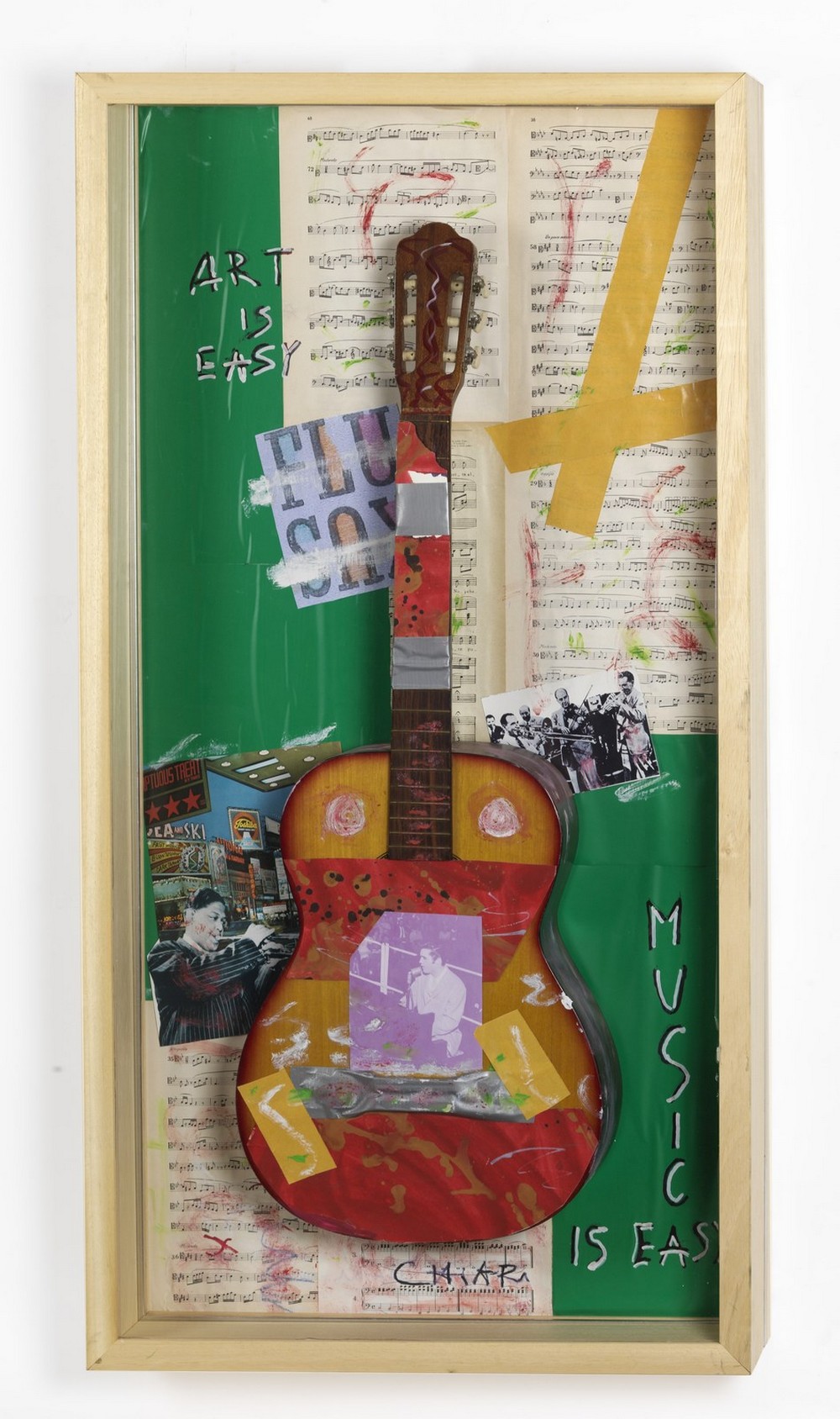 CHIARI GIUSEPPE (1926 - 2007) Art is easy, Music is easy. strumento su tavola. Cm 60,00 x 120,00. Firma in basso al centro. Autentica dell'artista su fotografia. Entro teca di legno. Cornice presente