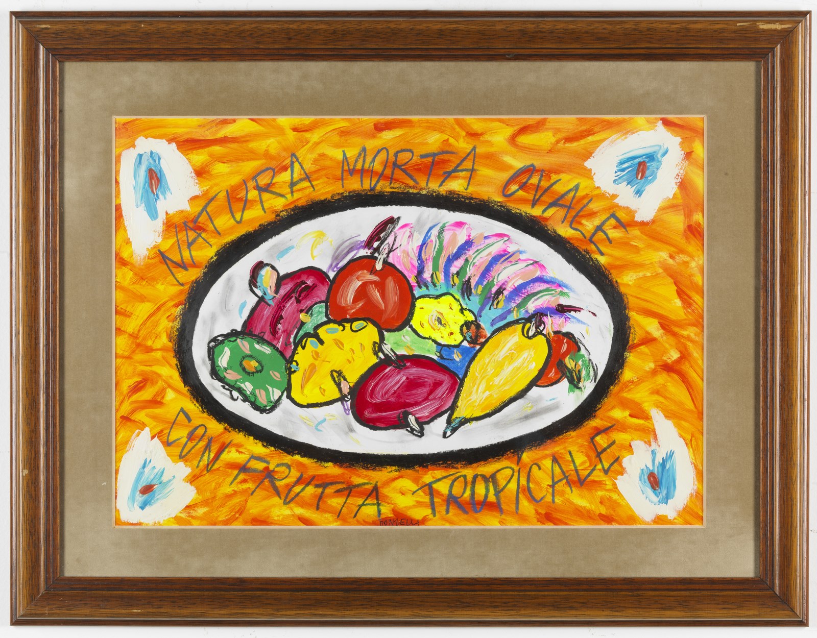 DONZELLI BRUNO (n. 1941) Natura morta ovale con frutta tropicale. Tecnica mista su carta. Cm 59,00 x 43,00. Firma in basso al centro. Cornice presente