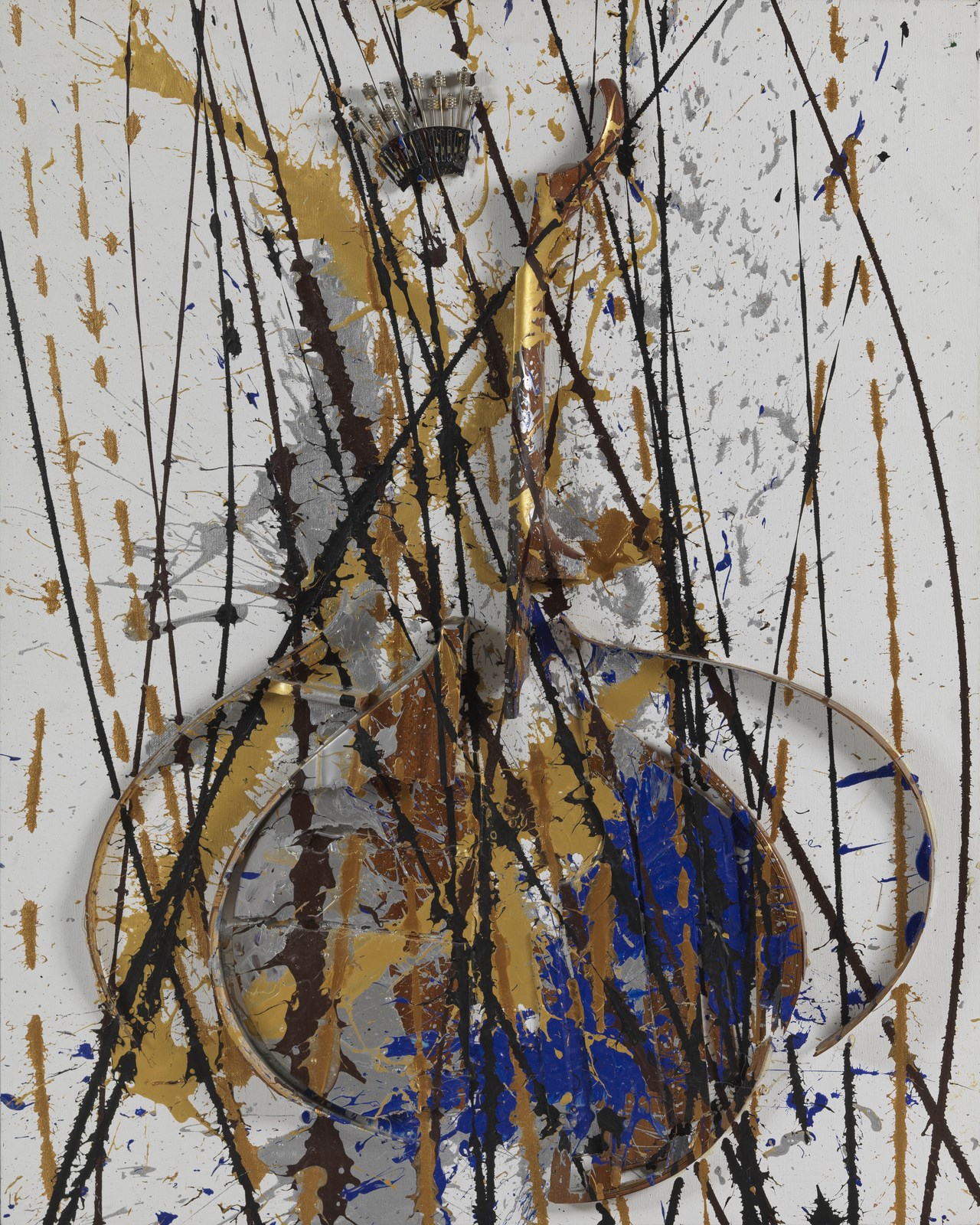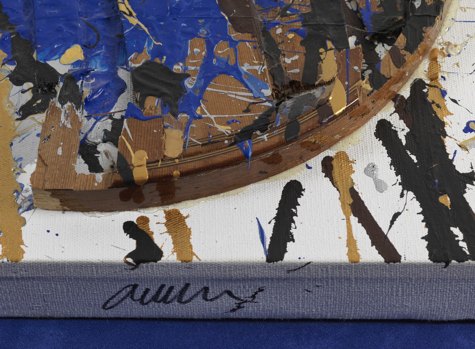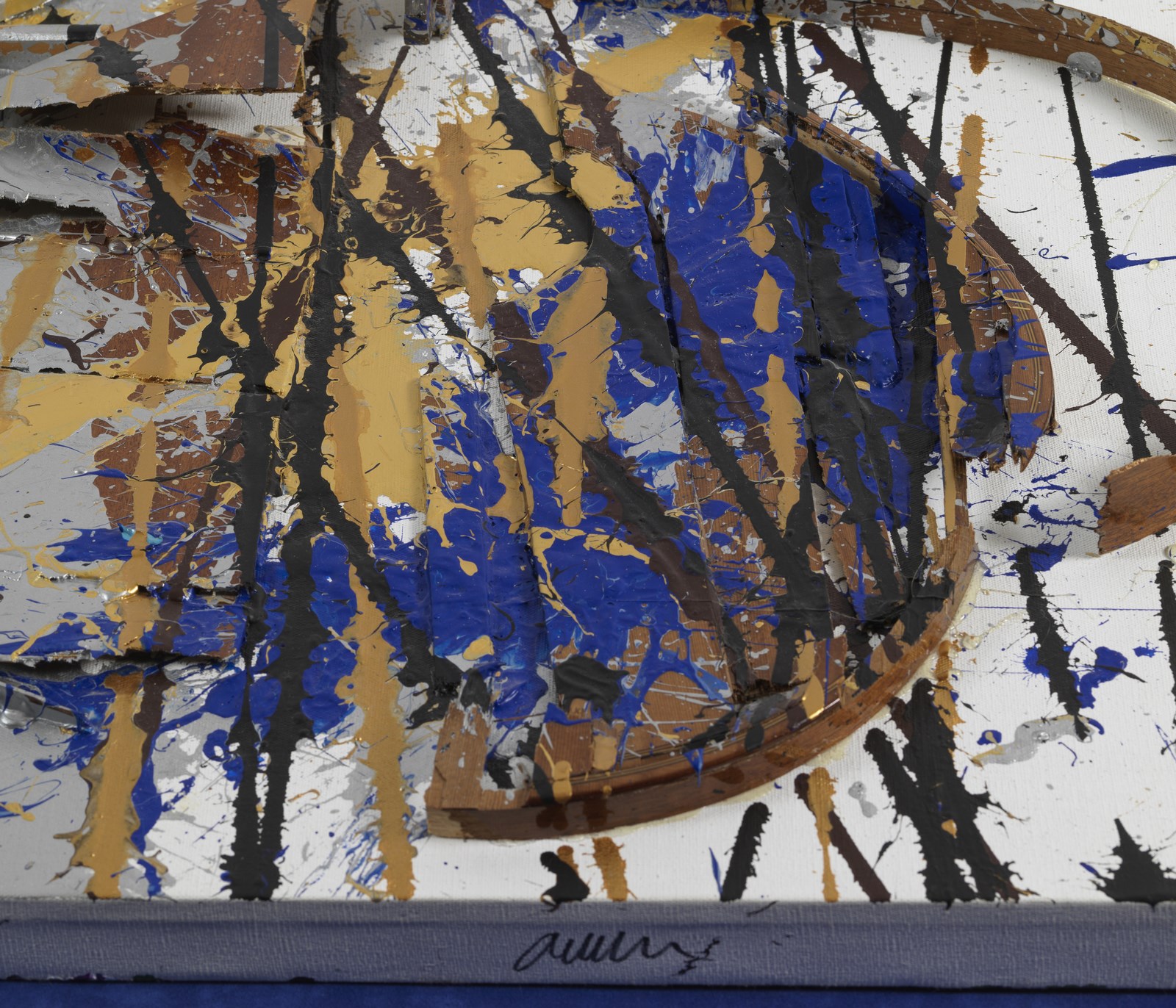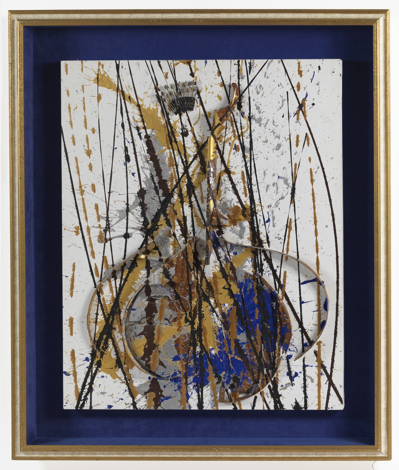 ARMAN FERNANDEZ (1928 - 2005) Senza titolo. 2002. Tecnica mista e applicazioni su tela. Cm 80,00 x 100,00 x 10,00. Firma sul lato in basso. Autentica dell'artista su fotografia riportante il relativo numero d'inventario e l'etichetta dell'Archivio delle opere di Arman presso la Galleria Dante Vecchiato, Padova. Entro teca di plexiglass. Cornice presente