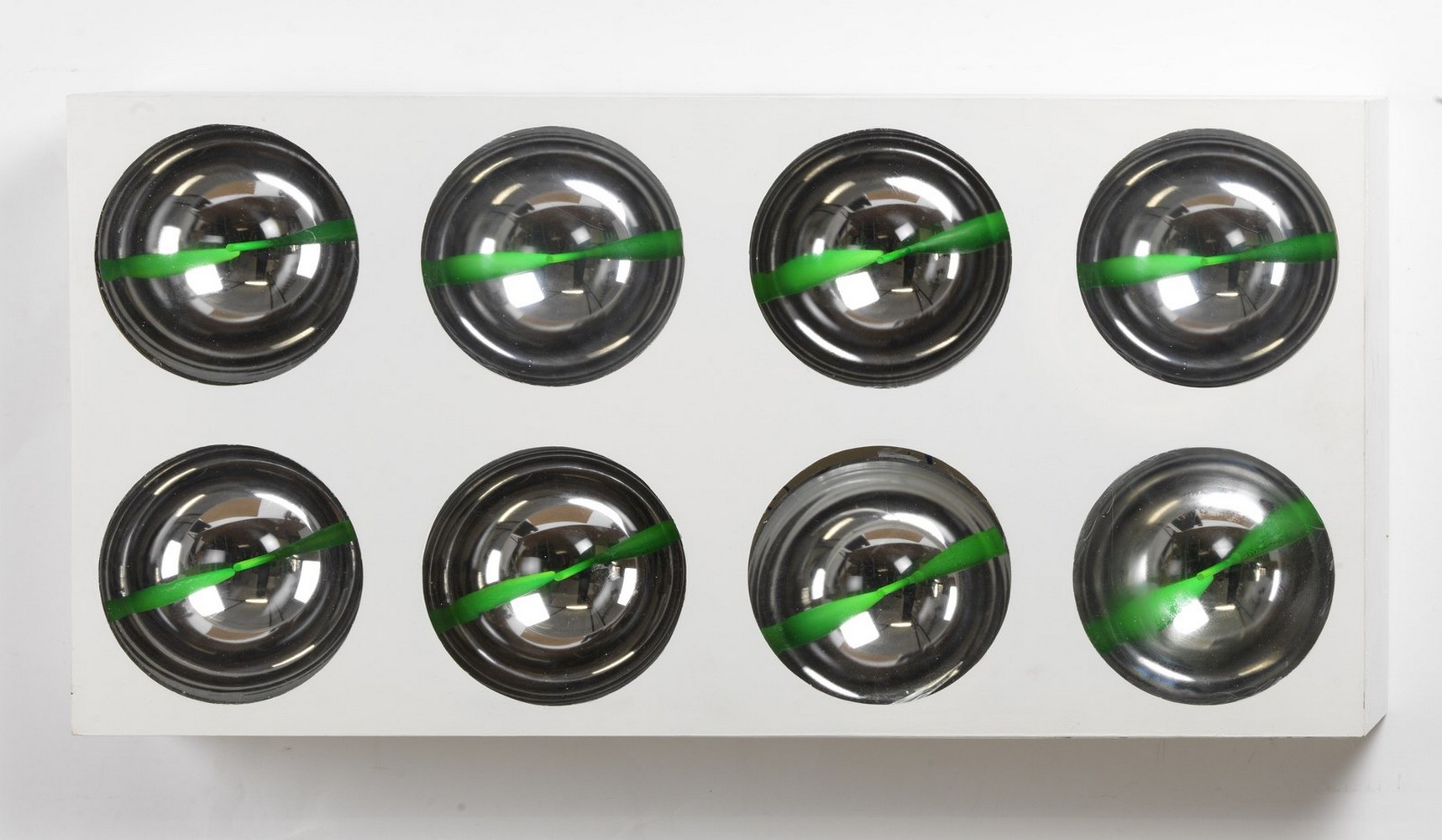COSTALONGA FRANCO (n. 1933) Oggetto cromocinetico. Sfere in metacrilato. Cm 70,00 x 35,00 x 8,80. Anni '70. Autentica dell'artista su fotografia. Autentica su fotografia dell'Archivio generale delle opere di Franco Costalogna