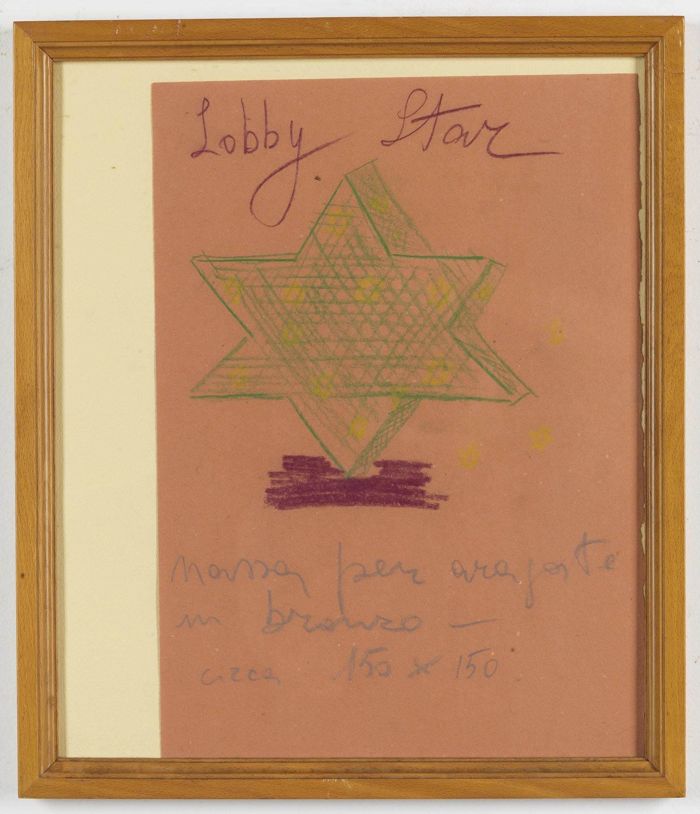 MONDINO ALDO (1938 - 2005) Lobby star. Tecnica mista su carta. Cm 24,00 x 36,00. Titolo in alto al centro. Bozzetto preparatorio per la scultura in bronzo, 108x16x25 cm, realizzata nel 1989 e pubblicata sul catalogo generale delle opere di Aldo Mondino, Vol.1, pag.614. Cornice presente