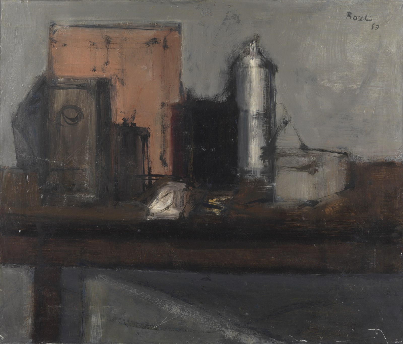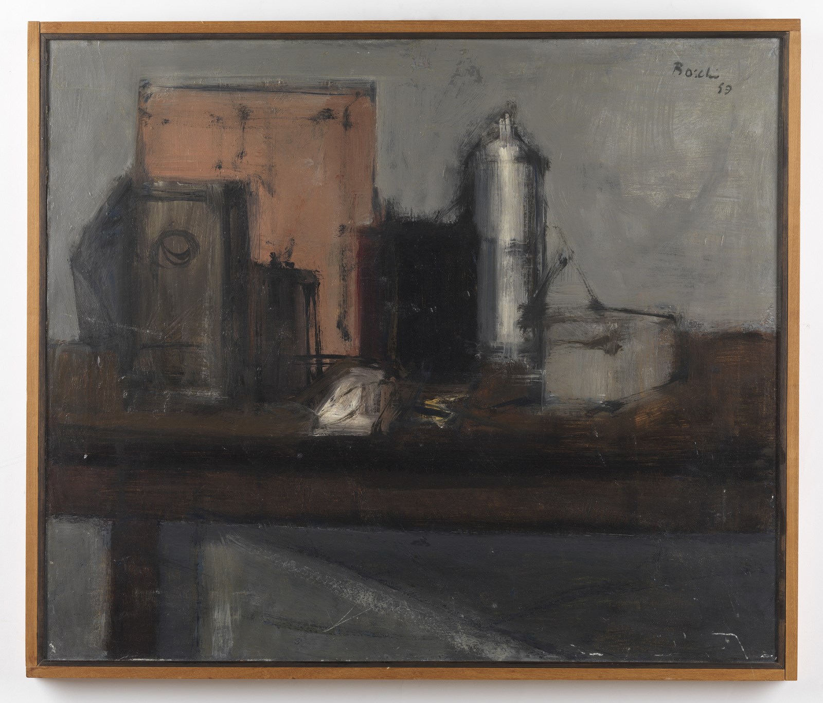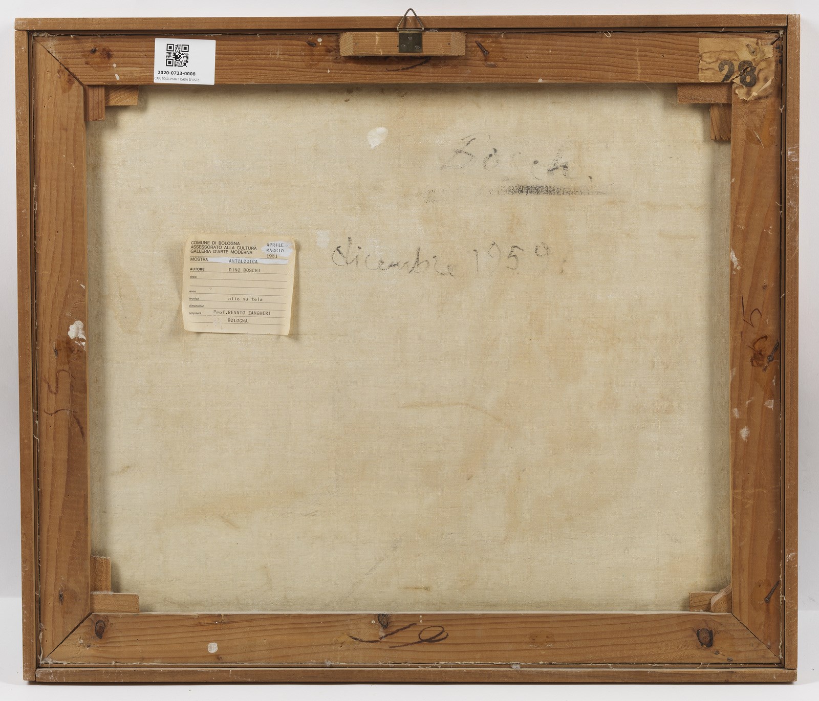 BOSCHI DINO (n. 1923) Senza titolo. 1959. Olio su tela . Cm 55,00 x 61,00. Firma e anno in alto a destra e al retro. Esposizione: Mostra Antologica Dino Boschi, Aprile - Maggio 1981, Galleria d'arte Moderna, Bologna. Cornice presente