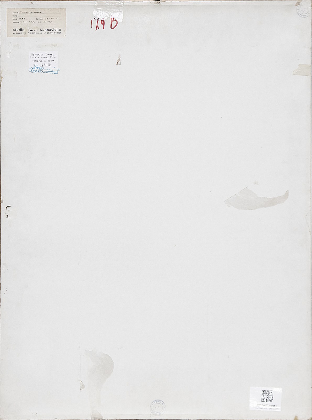 ZIMMER BERNARD (n. 1948) Senza titolo. 1987. Tecnica mista su carta. Cm 47,00 x 64,00. Firma in basso a sinistra. Al retro cartiglio descrittivo Studio d'arte Cannaviello, Milano. Provenienza: Studio Oggetto, Milano. Cornice presente