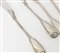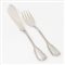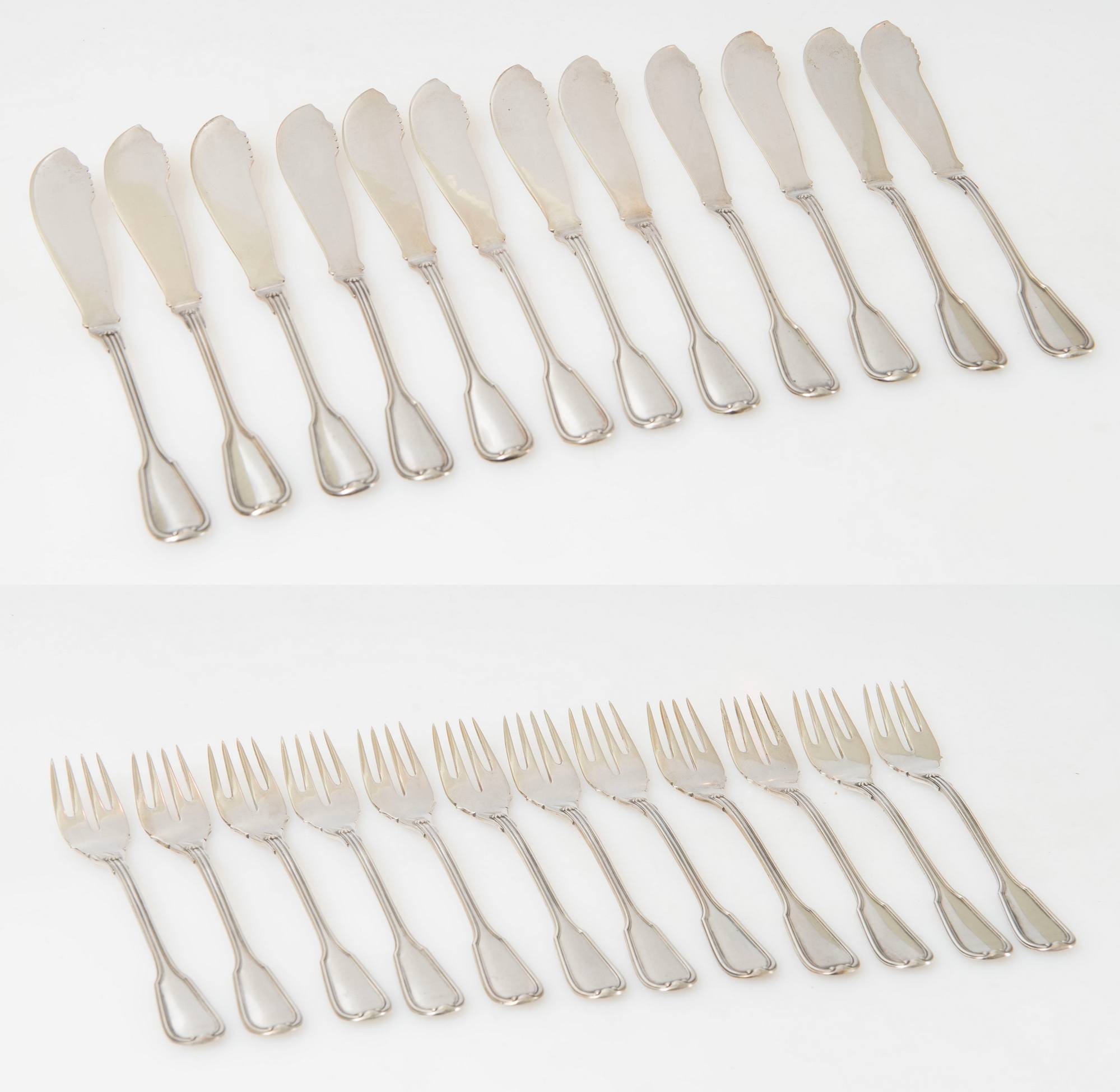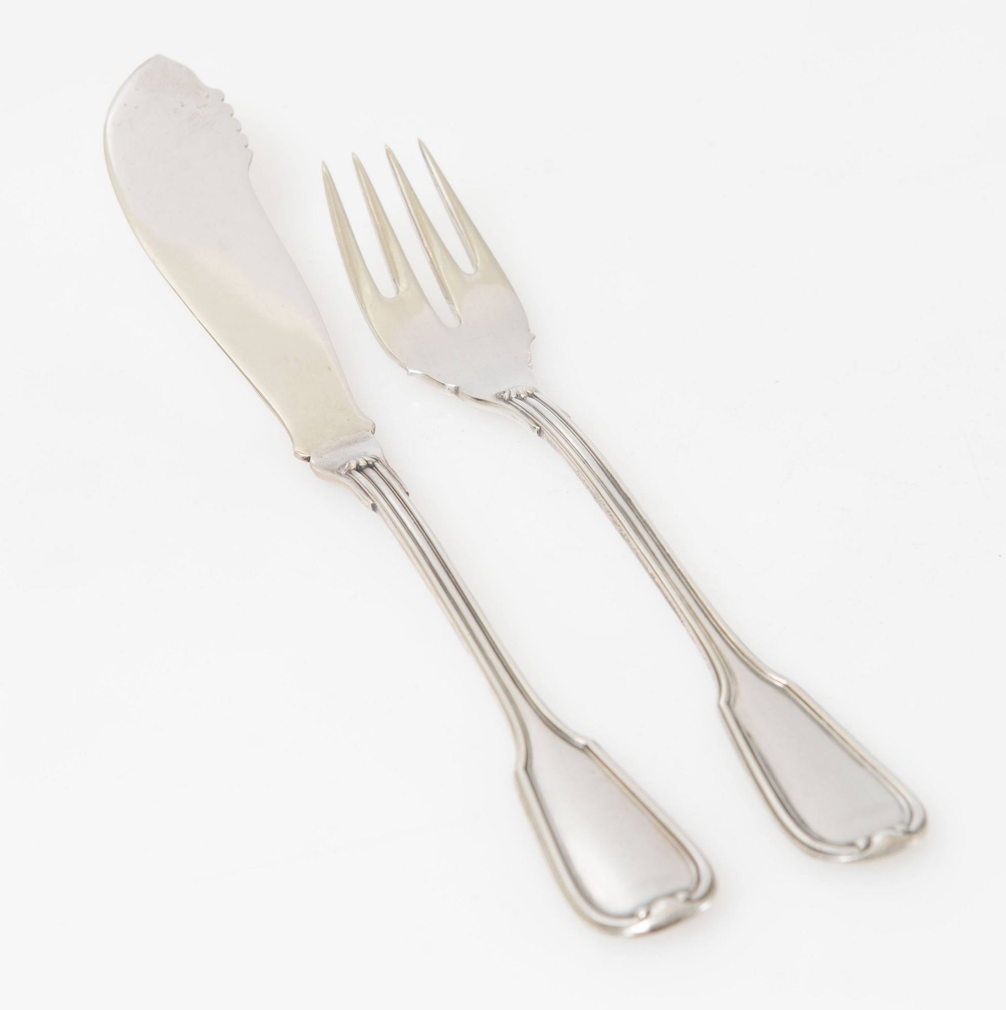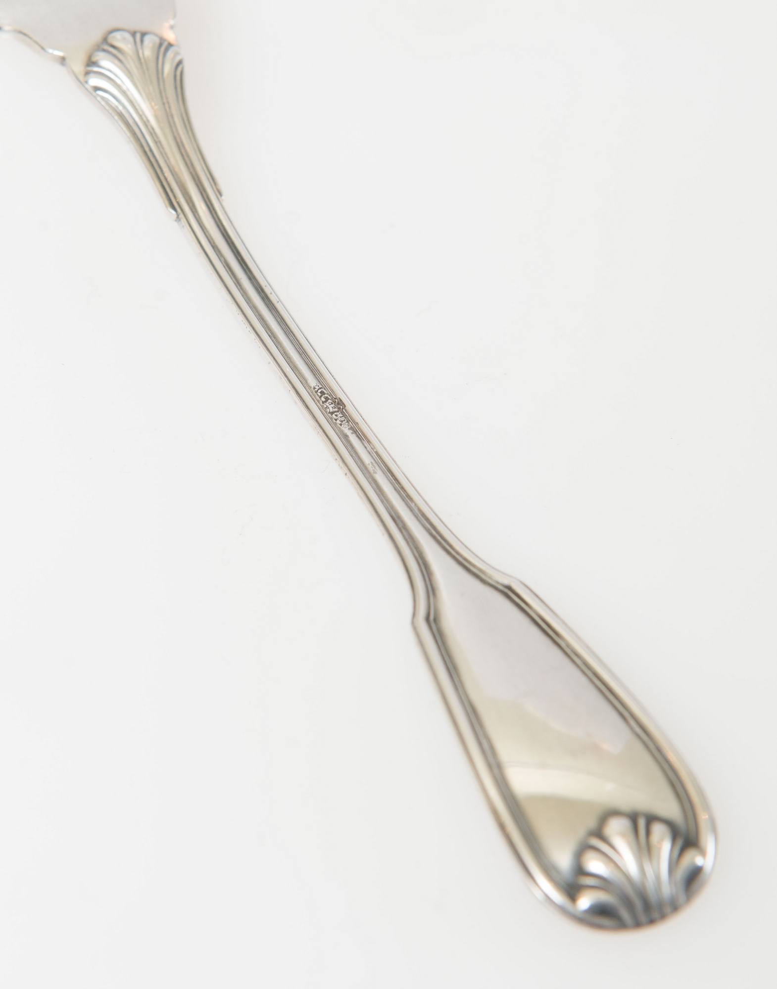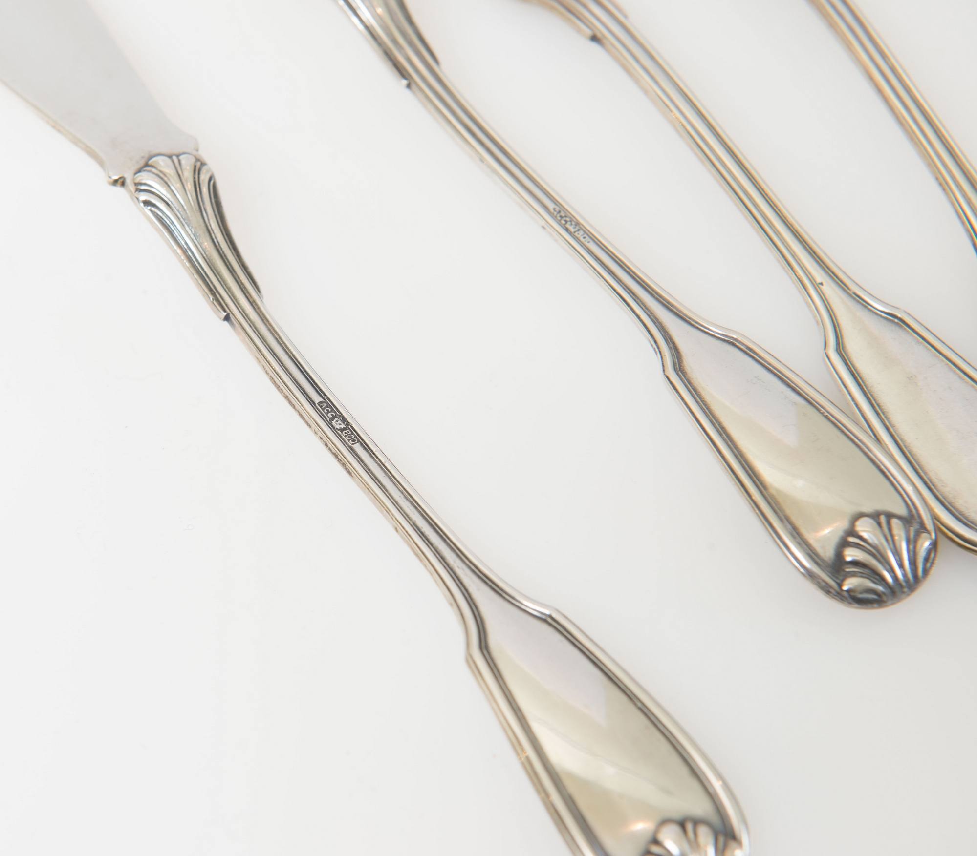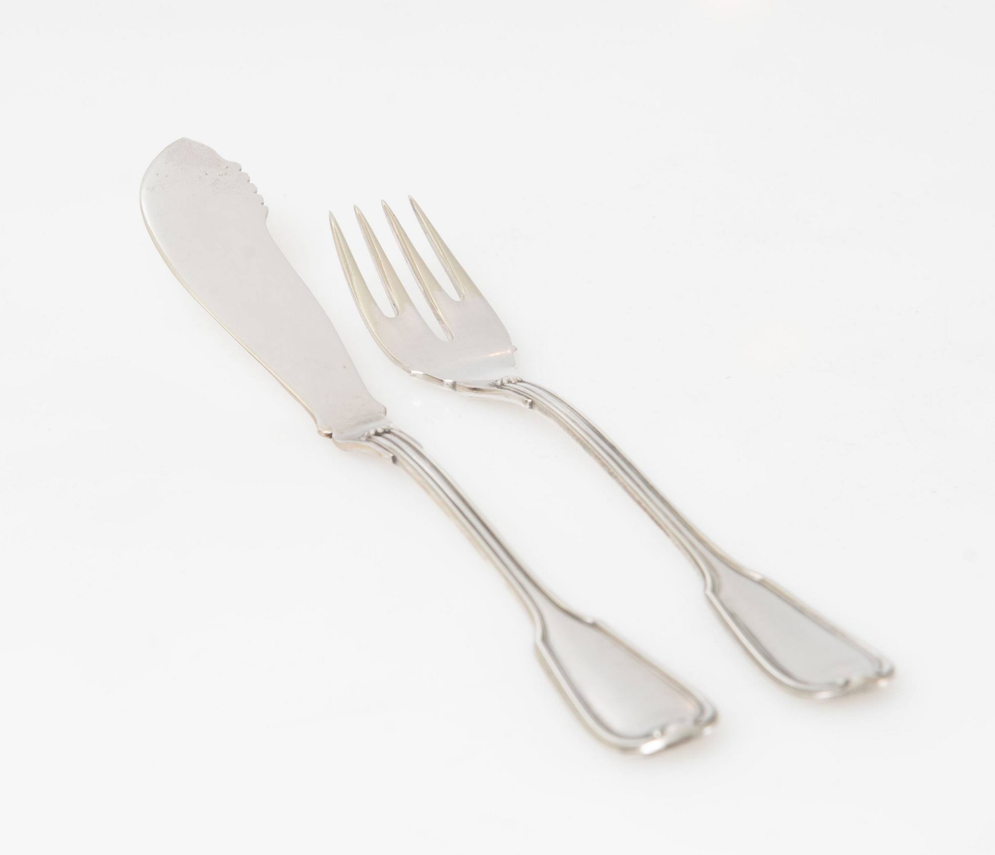 Servizio da pesce per dodici persone in argento 800, modello “Conchiglia, composto da12 coltelli e 12 forchette. Sul retro del manico recano punzoni: 800, ACC e corona costituita da tre torri al cui interno vi sono una forchetta e un cucchiaio. Peso complessivo: 1392 gr.