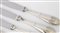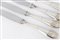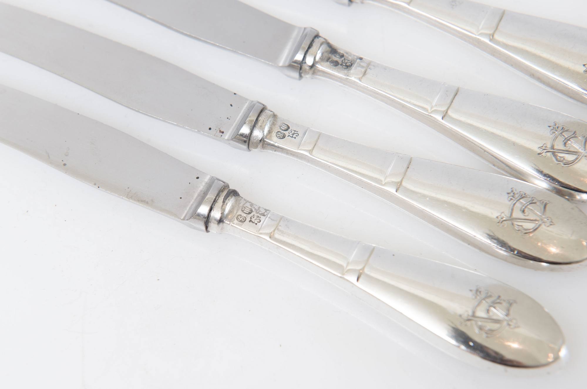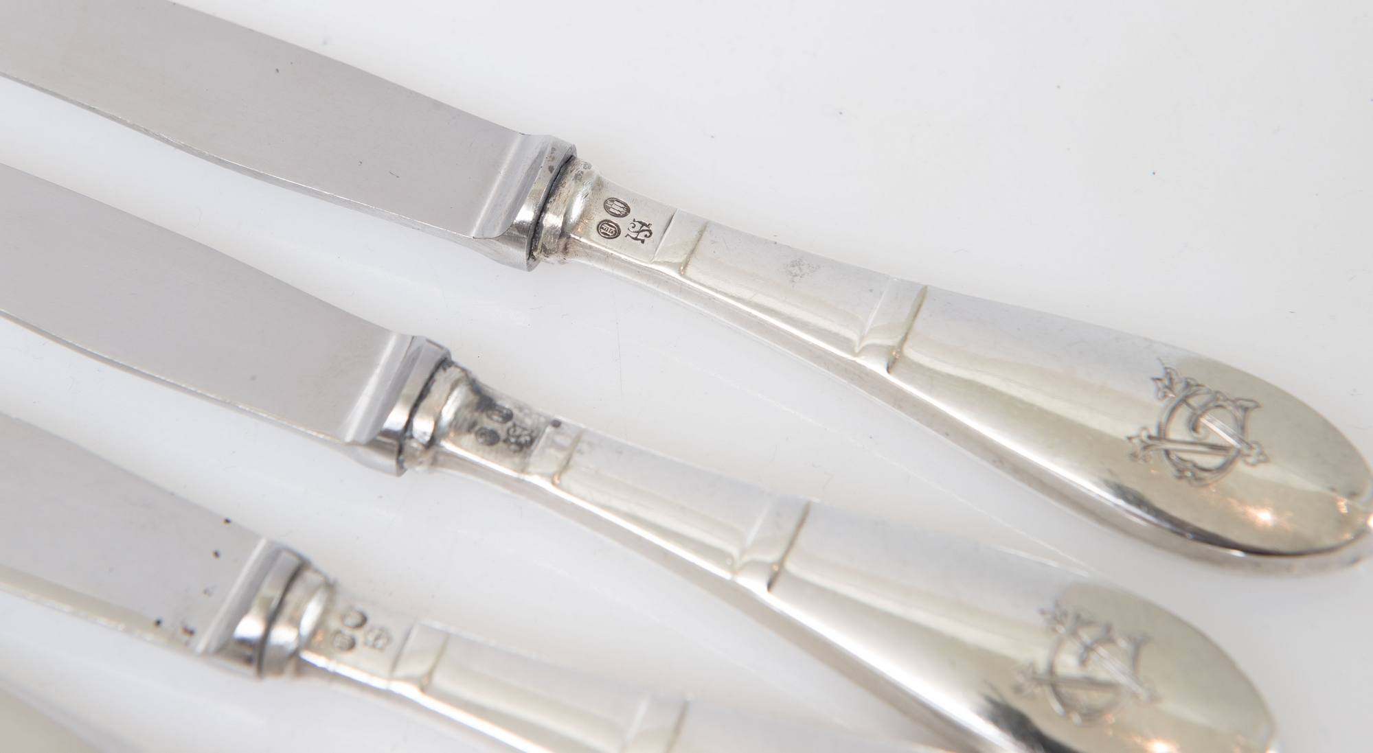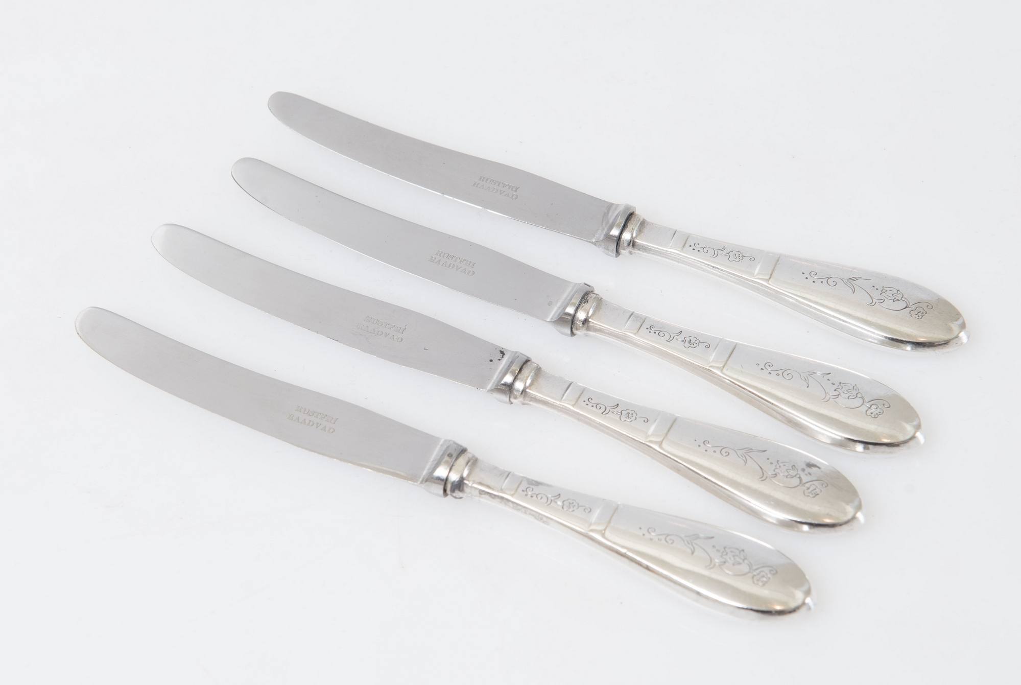 Quattro coltelli piccoli da dessert con manico in argento. Al retro recano punzoni: CHF, castello danese, HS.