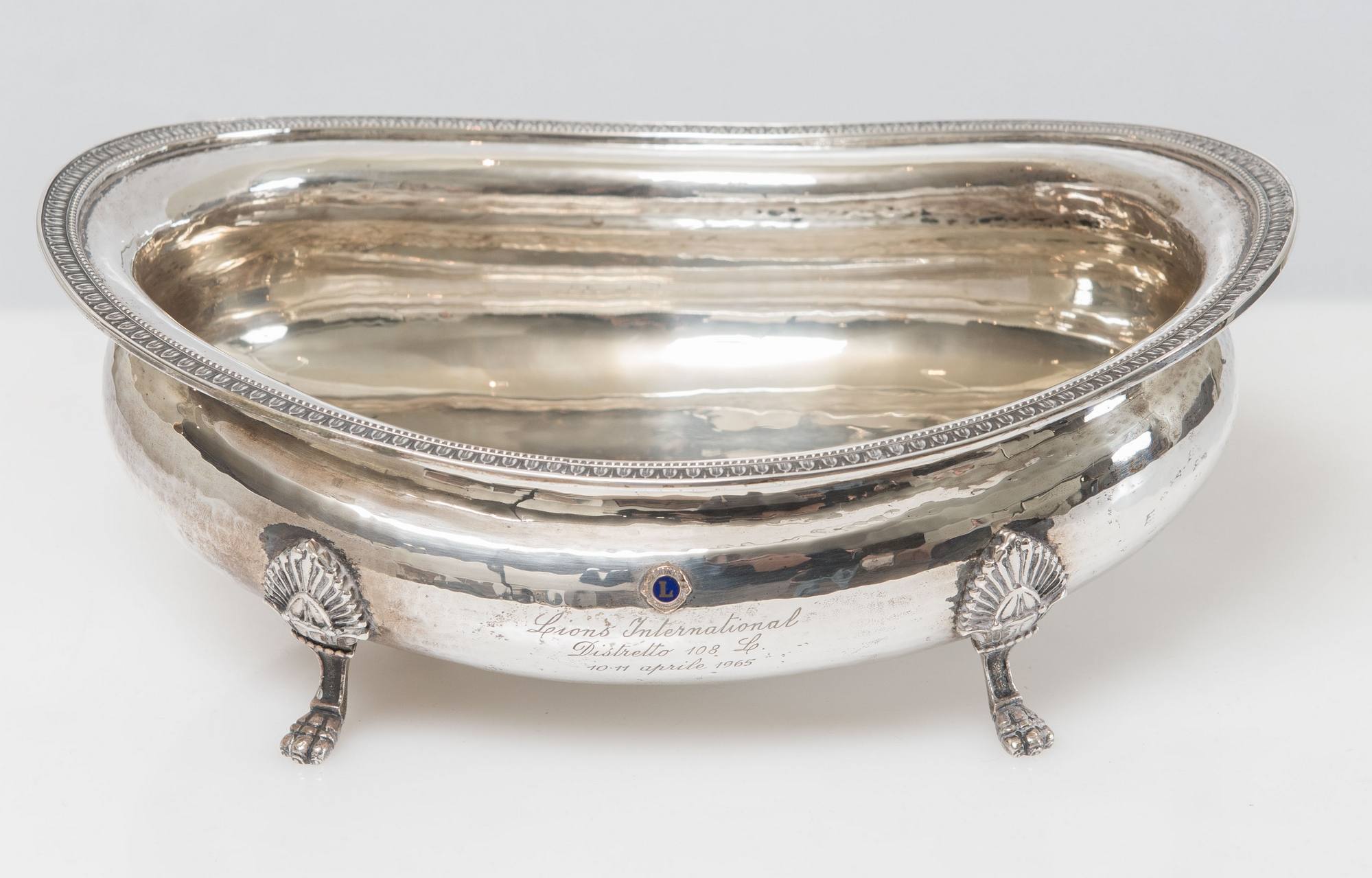 Alzatina in argento 800. Reca incisione Lions International con stemma L. Nella parte inferiore del bordo reca punzoni: 800, RC, 20AL. Inoltre reca etichetta parzialmente leggibile Mancini Gioiellieri – Roma. Peso: 361 gr.