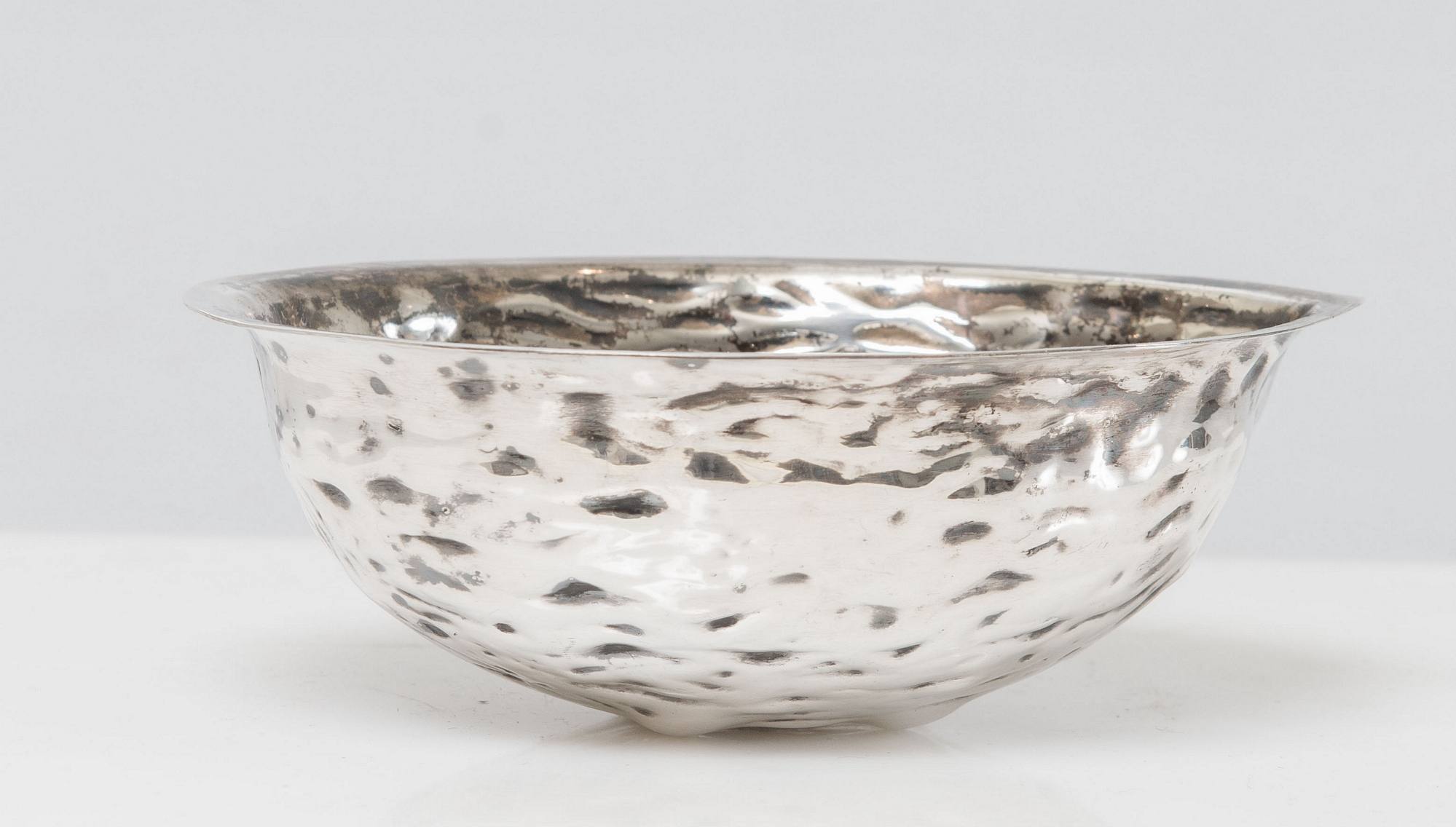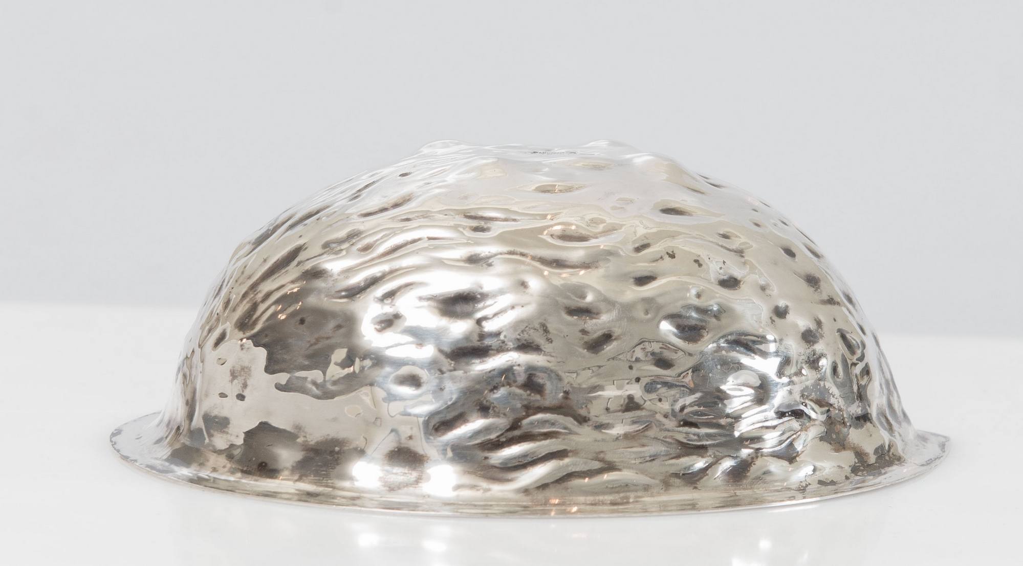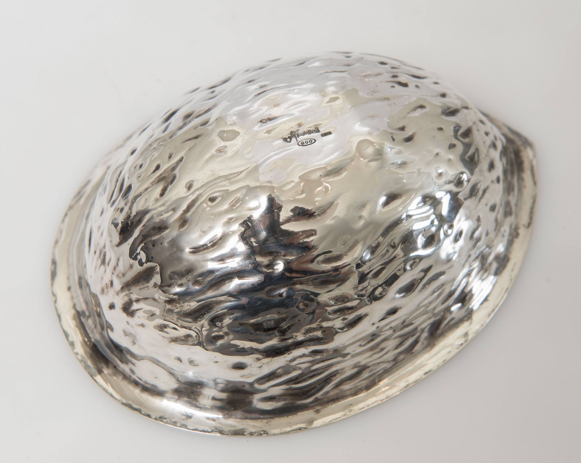 Ciotola a forma di noce in argento 800. Sotto la base recca punzoni: 800, 825MI, firma degli argentieri. Peso: 128 gr.