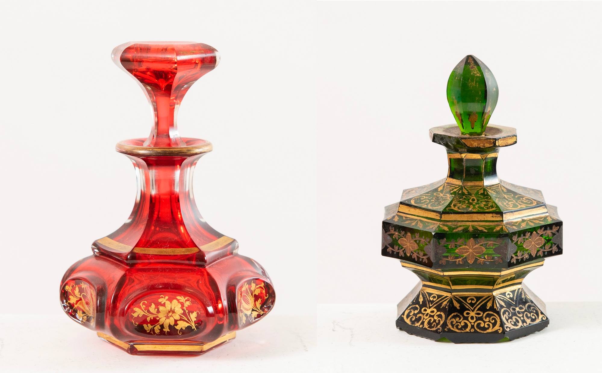 Coppia di bottiglie porta profumo in vetro molato e dorato. Italia, XIX secolo. Sbeccatura sul collo della bottiglia verde. Rispettivamente di H. cm 13 e Ø cm 9, e di H. cm 12 e Ø cm 8.