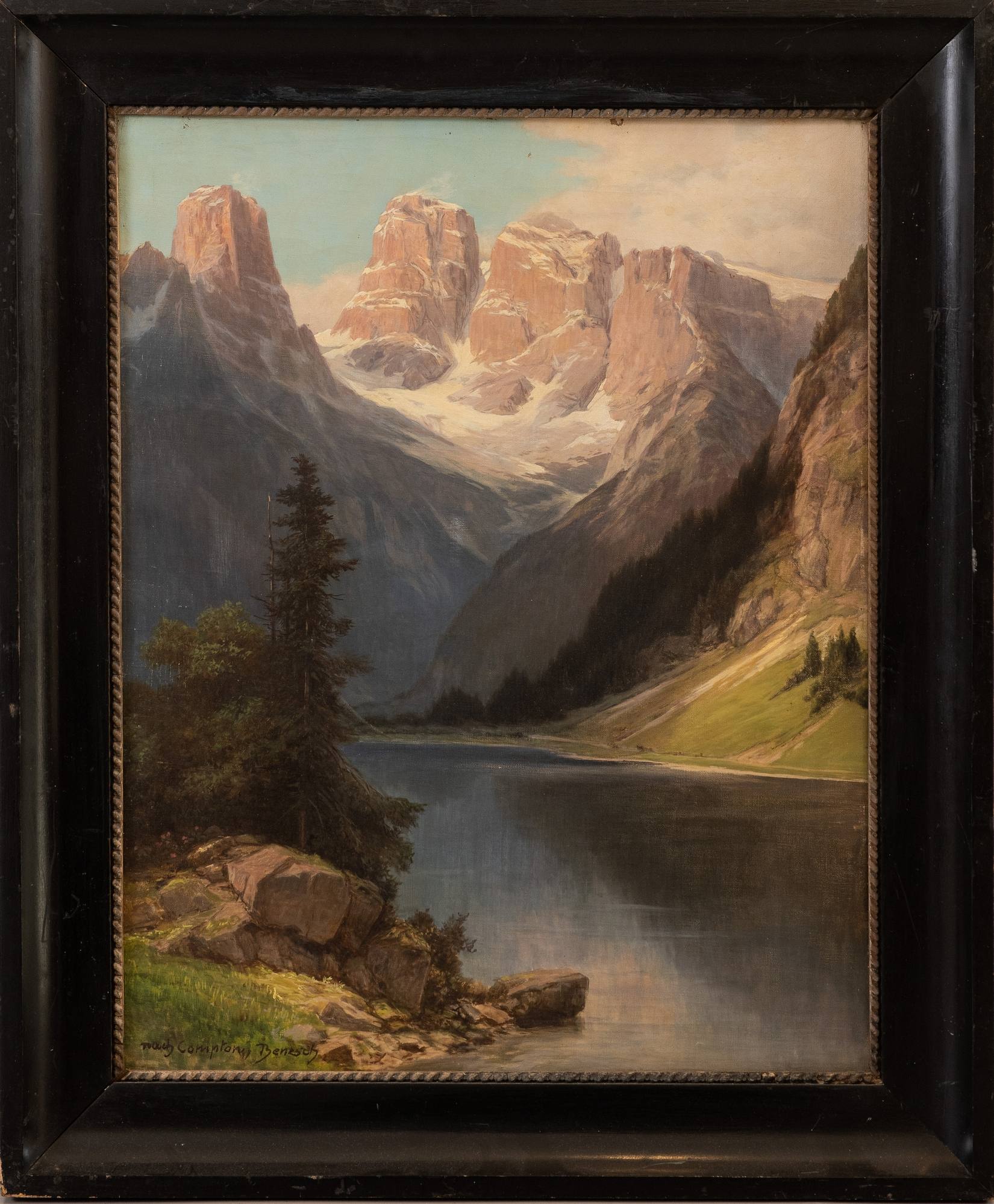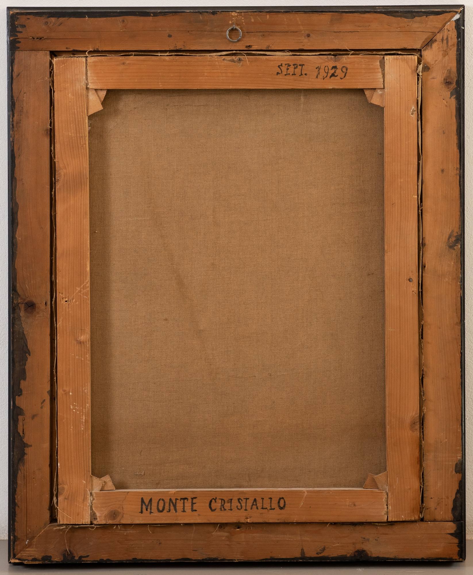Pittore anonimo della prima metà del XX secolo“Monte Cristallo” 1929. Olio su tela. Cm 67,5X52,5. Opera dedicata in basso a sinistra Nach Compton Benesch. Al retro l’opera è datata e intitolata sul telaio.