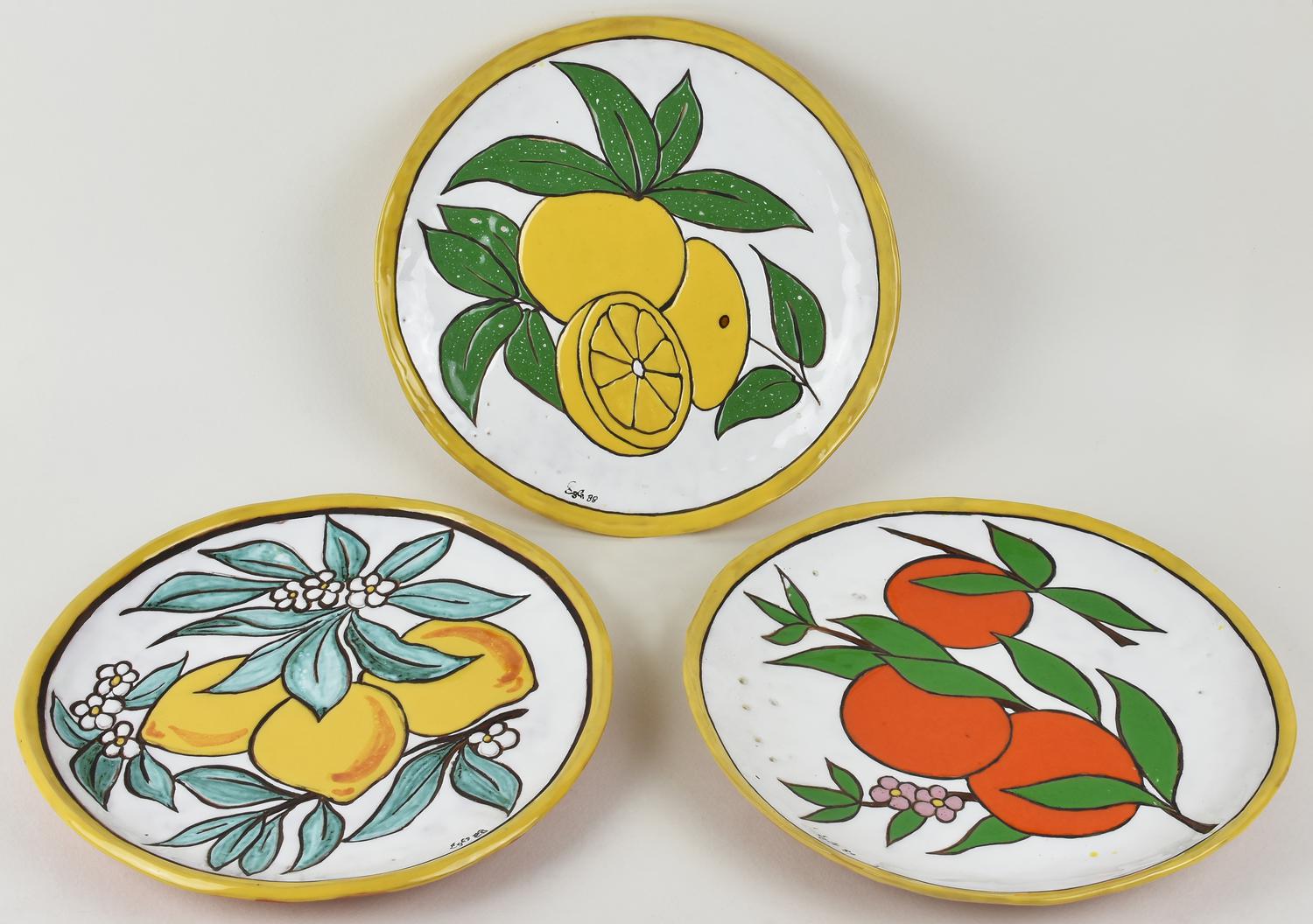 LOTTO DI 3 PIATTI in terracotta con decorazioni a smalto eseguite con la...