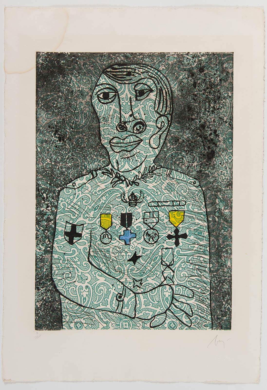 Enrico Baj (Milano 1924 – Vergiate 2003), “Personaggio di Guerra”, 1971. Acquaforte e acquatinta a colori, firmata in basso a destra Baj, numero di tiratura in basso a sinistra 7/125, timbro a secco in basso a destra ‘Graphis Arte’, Lastra H cm 53x39 – Foglio H cm 70x50 Bibliografia di riferimento: brochure Graphis Arte.