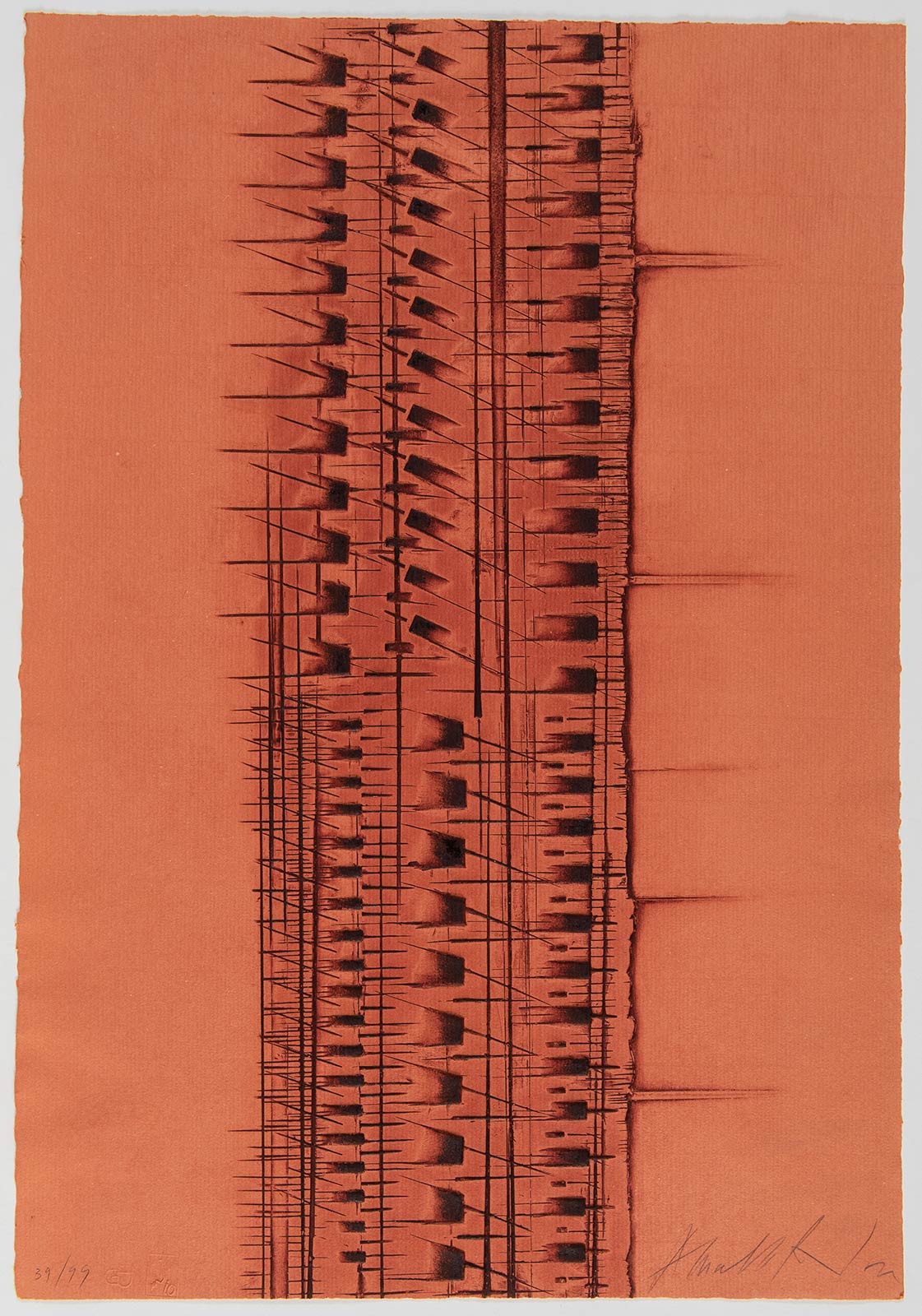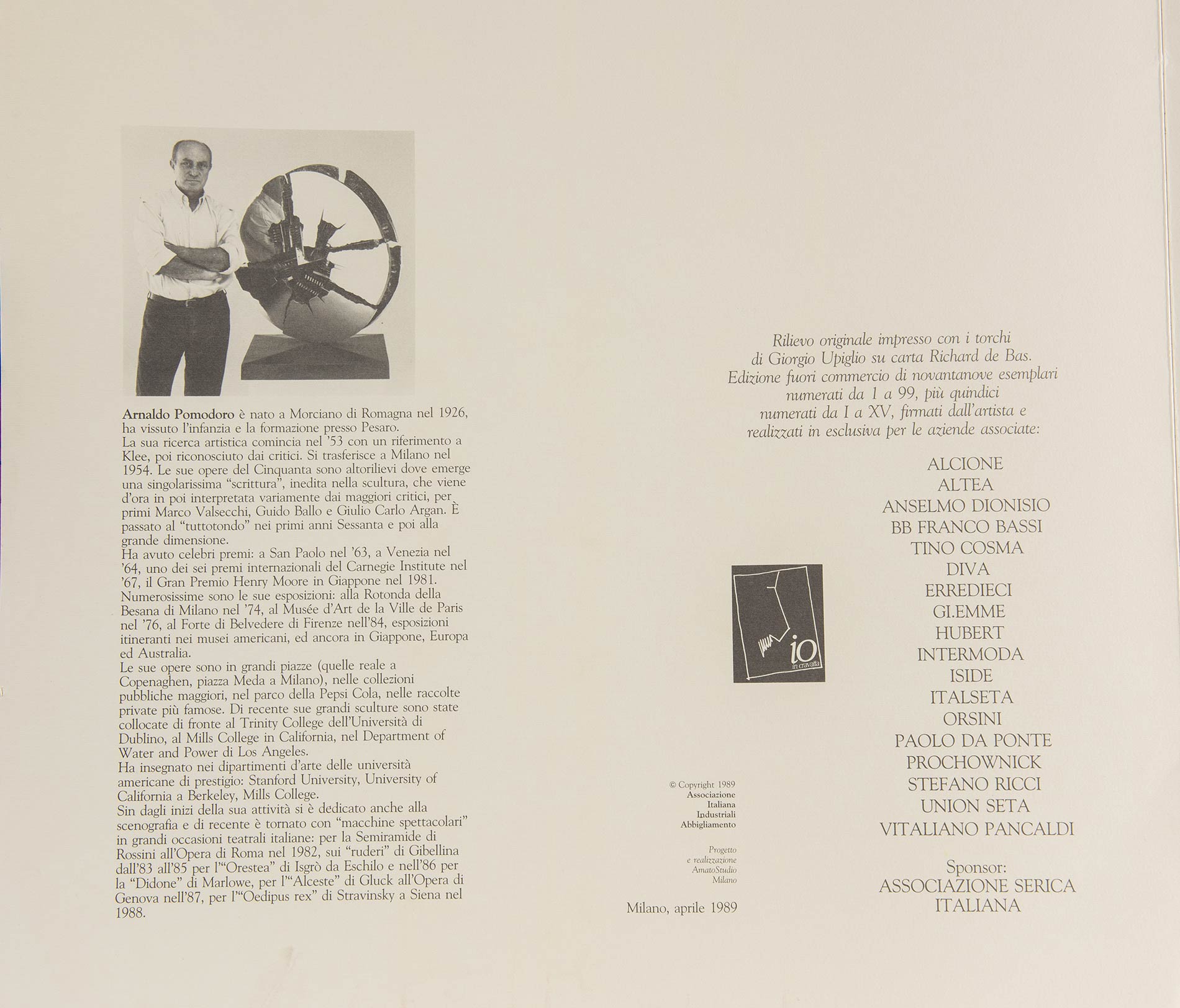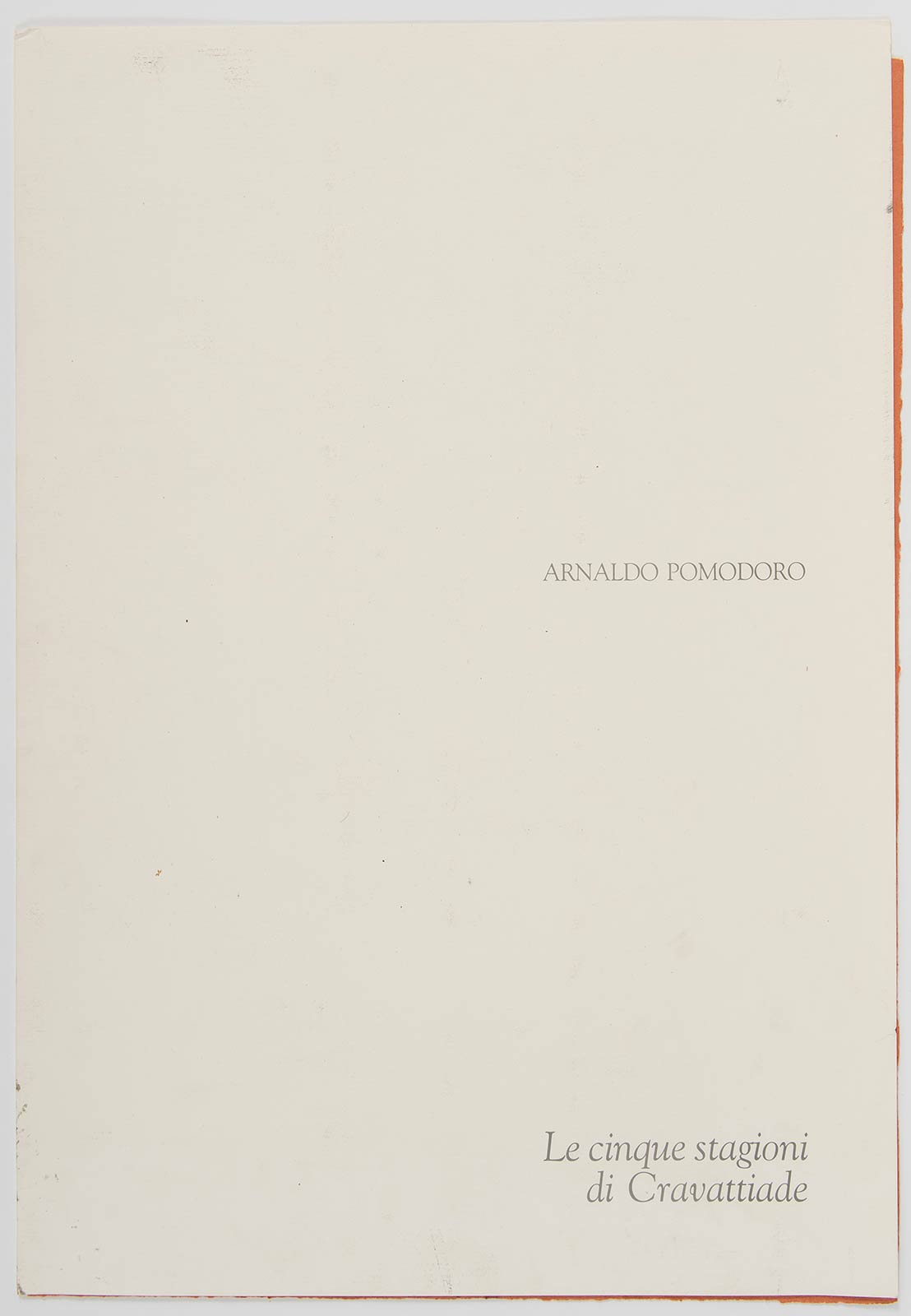 Arnaldo Pomodoro (Morciano di Romagna 1926), “Senza titolo”, 1989. Serigrafia a colori su carta, firmata in basso a destra Arnaldo Pomodoro, numero di tiratura in basso a sinistra 39/99, timbri a secco ‘Io in cravatta’ in basso a sinistra, H cm 70x50 Entro cartellina “Le Cinque stagioni”.