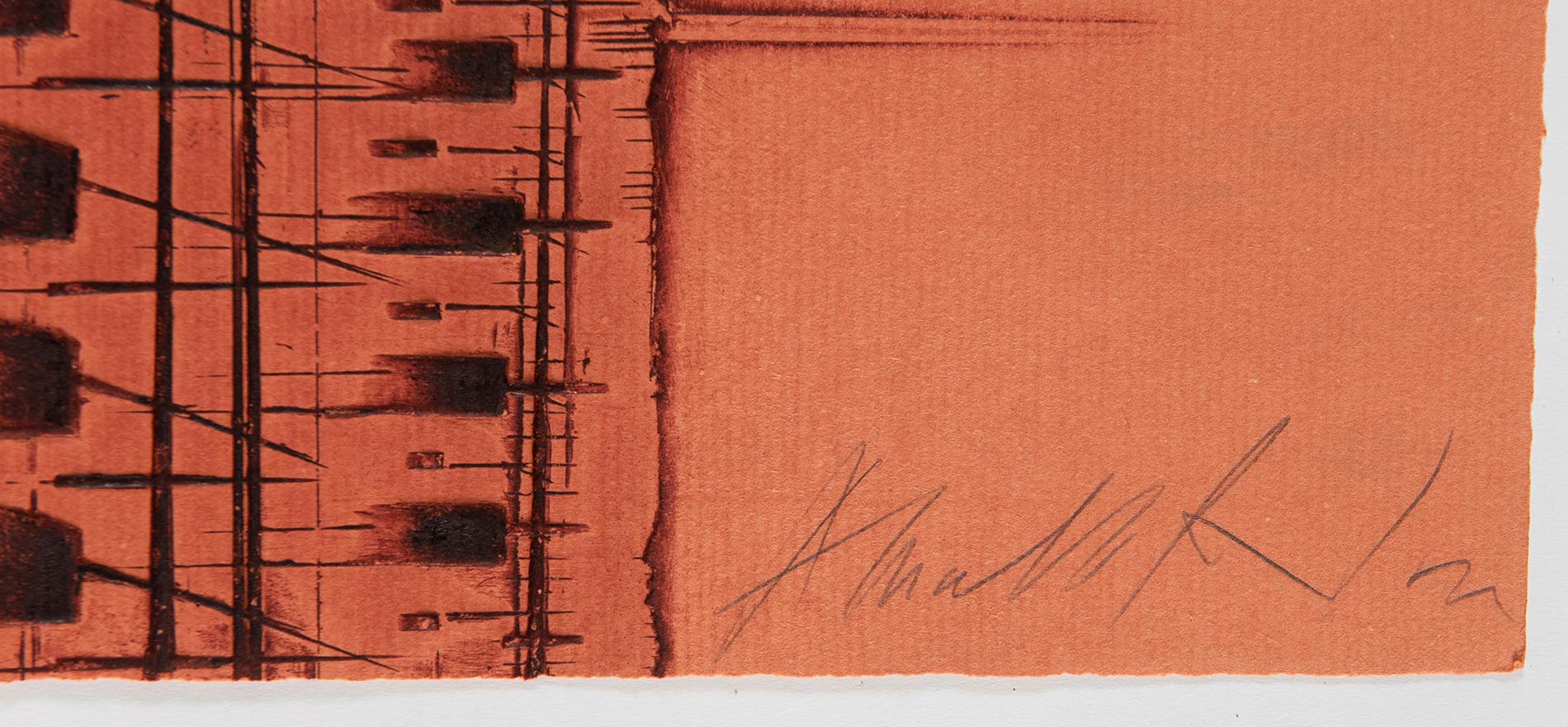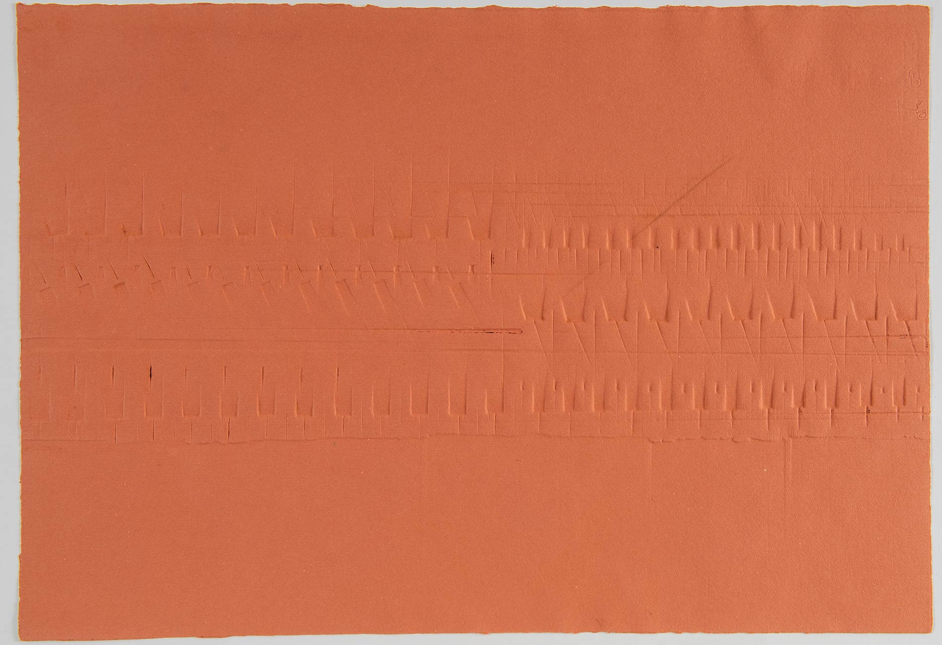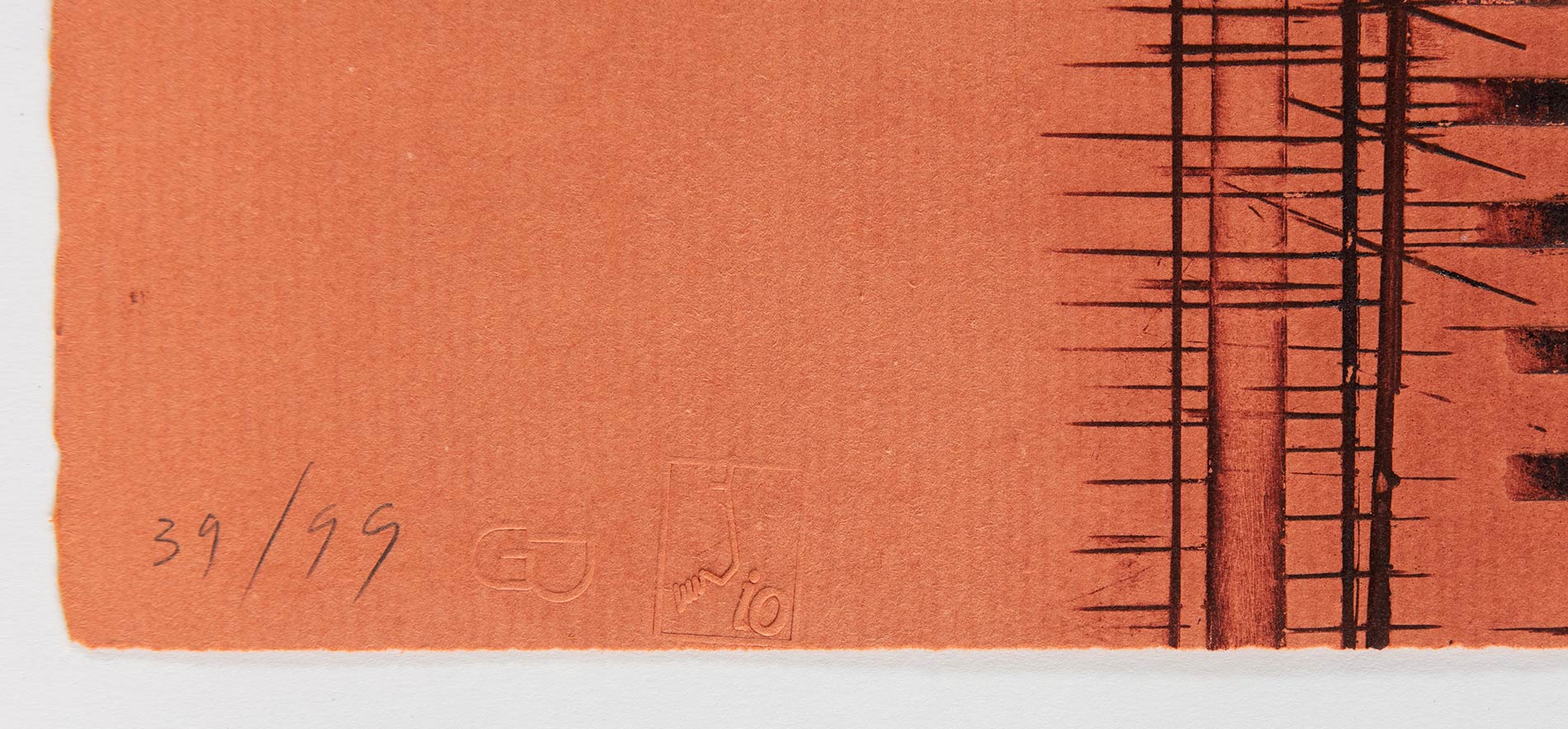 Arnaldo Pomodoro (Morciano di Romagna 1926), “Senza titolo”, 1989. Serigrafia a colori su carta, firmata in basso a destra Arnaldo Pomodoro, numero di tiratura in basso a sinistra 39/99, timbri a secco ‘Io in cravatta’ in basso a sinistra, H cm 70x50 Entro cartellina “Le Cinque stagioni”.